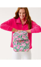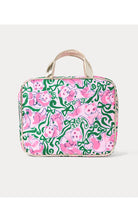Printed matte poly cosmetic case with top handles, zip closure and wipeable pvc interior.