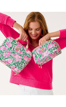 Printed matte poly lay-flat pouch zip closure, interior zipper pocket and elasticized interior pocket compartments.