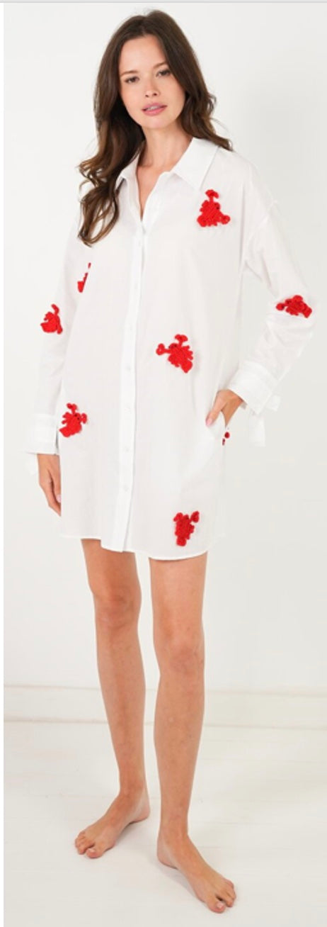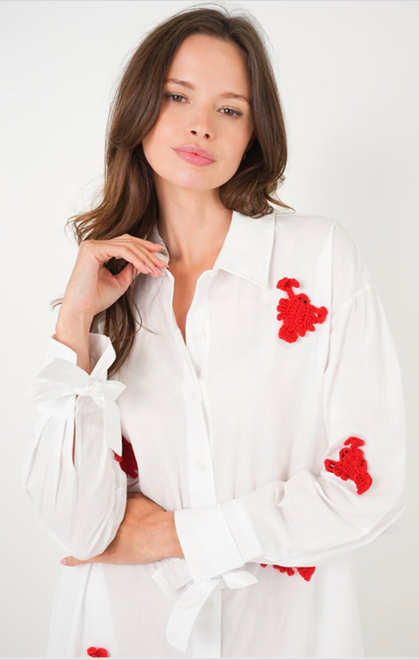A little coastal, a little playful—this crisp white shirt dress is the perfect statement piece for the season. Featuring bold red lobster appliqués throughout, it brings a fun, elevated twist to a classic silhouette.