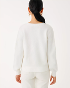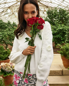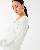 - Easy fit, long sleeve, v-neck sweater with blouson sleeves and novelty flower and butterfly crochet embroidery.