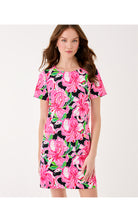 - Easy fit shift dress with a crew neckline, short sleeves, gold buttons, and an exposed back metal zipper.