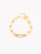 Elevate your everyday look with this modern gold link bracelet. Featuring oversized rectangular links with a sleek polished finish, the design is anchored by a center link adorned with sparkling pavé stones for a touch of glamour. A toggle clasp and signature charm add refined detail, making this piece perfect for stacking or wearing solo as a statement.