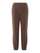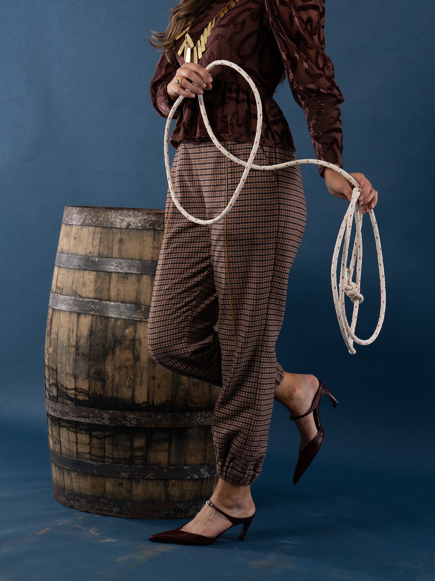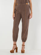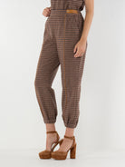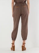 The Addison Jogger gives a modern update to a casual classic. Designed with an elastic waistband finished with tab details and gold snap buttons, this style blends comfort with polish. Elastic ankle cuffs create a tapered shape, while pressed front seams elongate the leg for a more tailored effect. Crafted in a wool-blend fabric with a classic check pattern, the jogger is elevated with vegan leather trim along the front seams and back welt pockets. Both slimming and chic, the Addison Jogger is an effortless blend of heritage fabric and contemporary design.