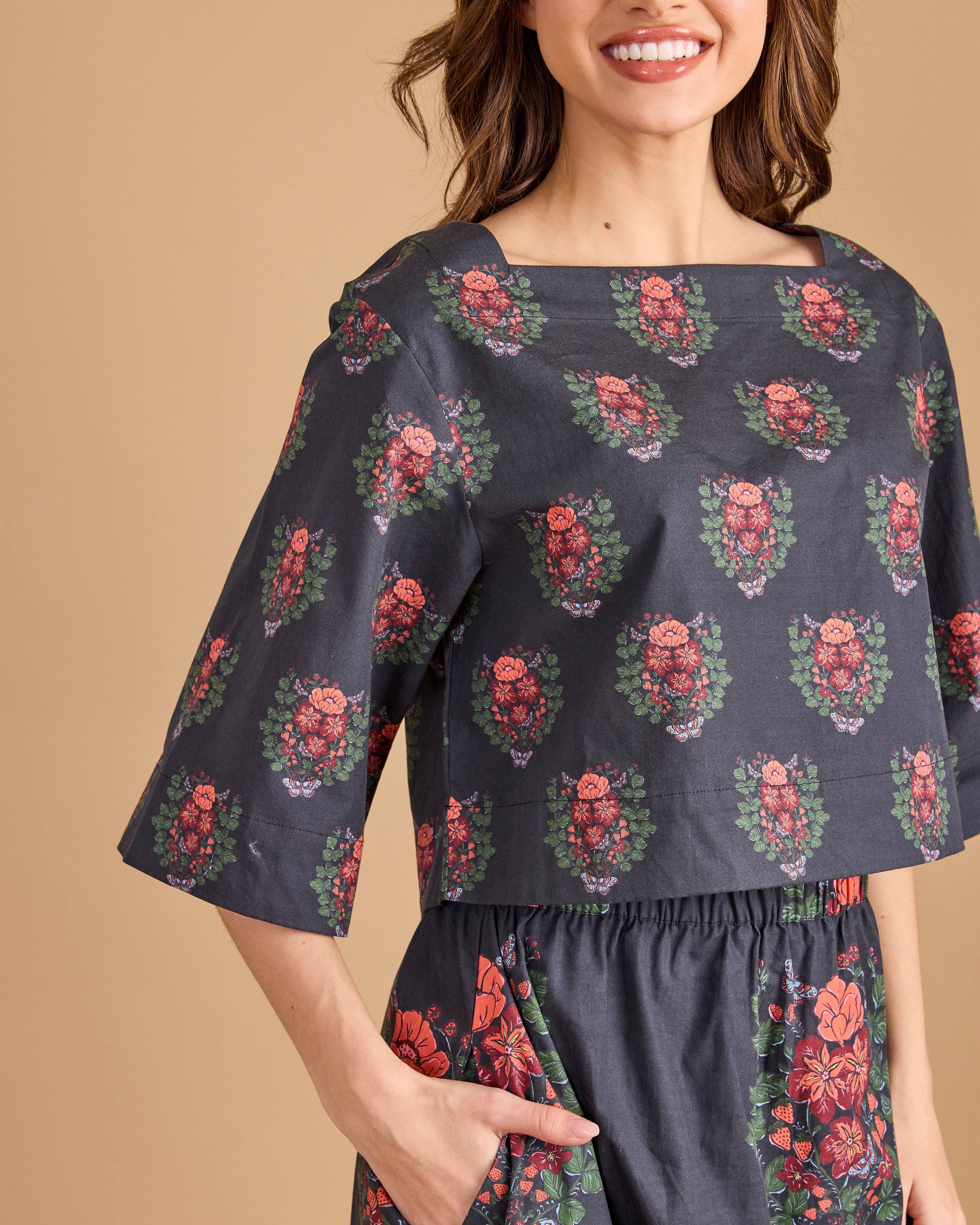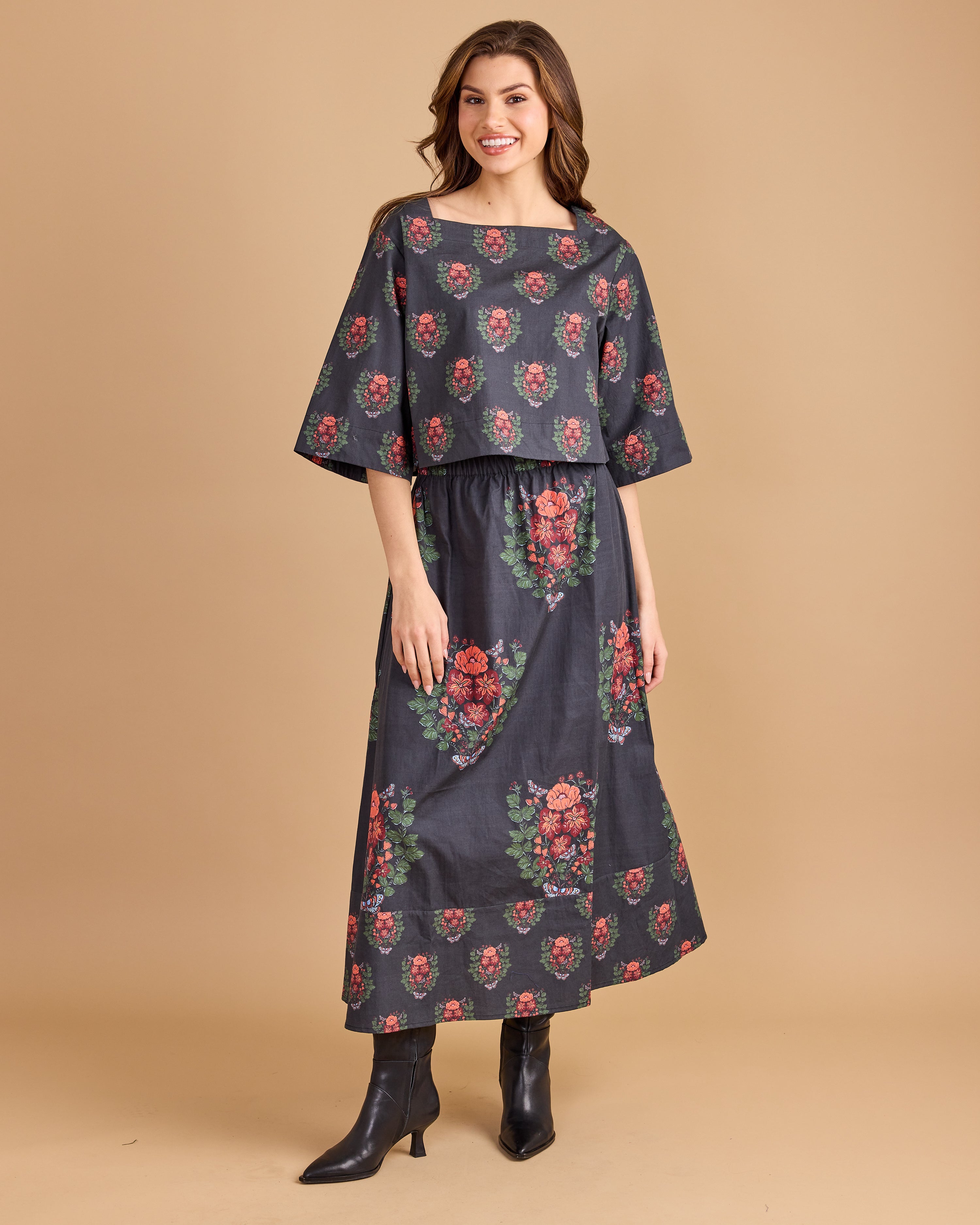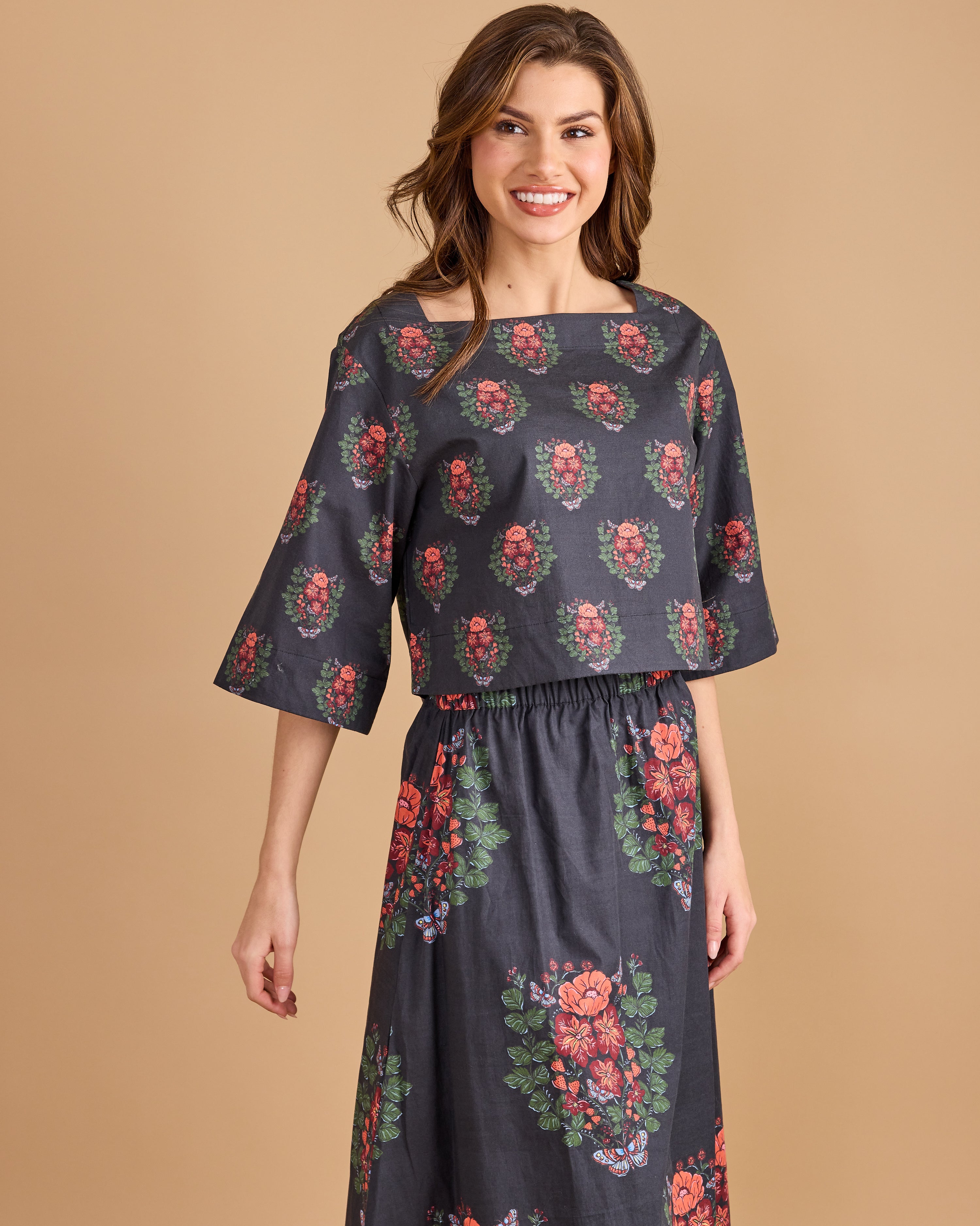 The Angie Top is a modern take on a timeless silhouette. Designed with a boxy, relaxed fit, it features wide three-quarter sleeves and a graceful bateau neckline for an effortlessly chic look. The bold floral print set against a dark backdrop makes it a standout piece, perfect for pairing with denim, skirts, or the matching Marisol Skirt for a coordinated set.