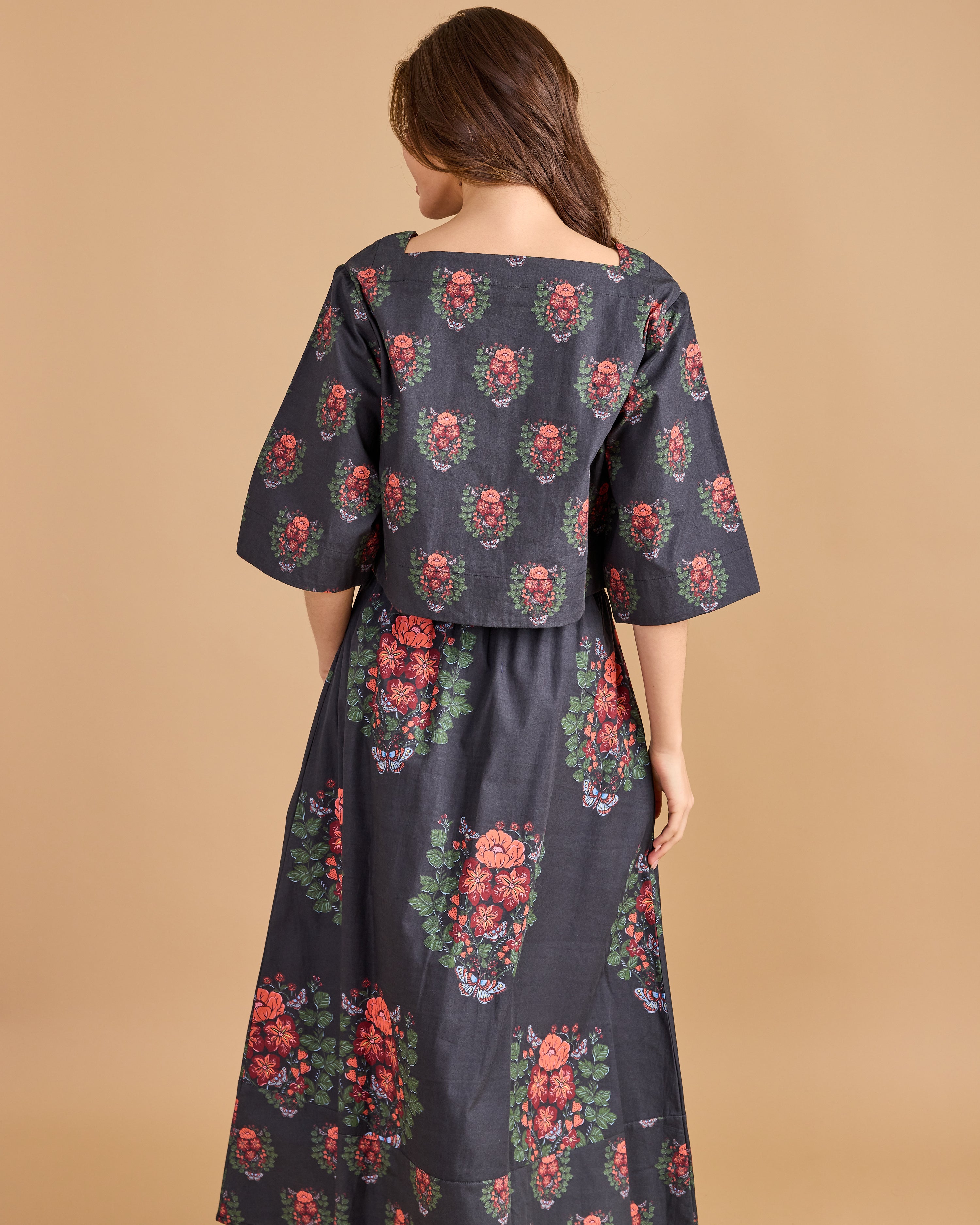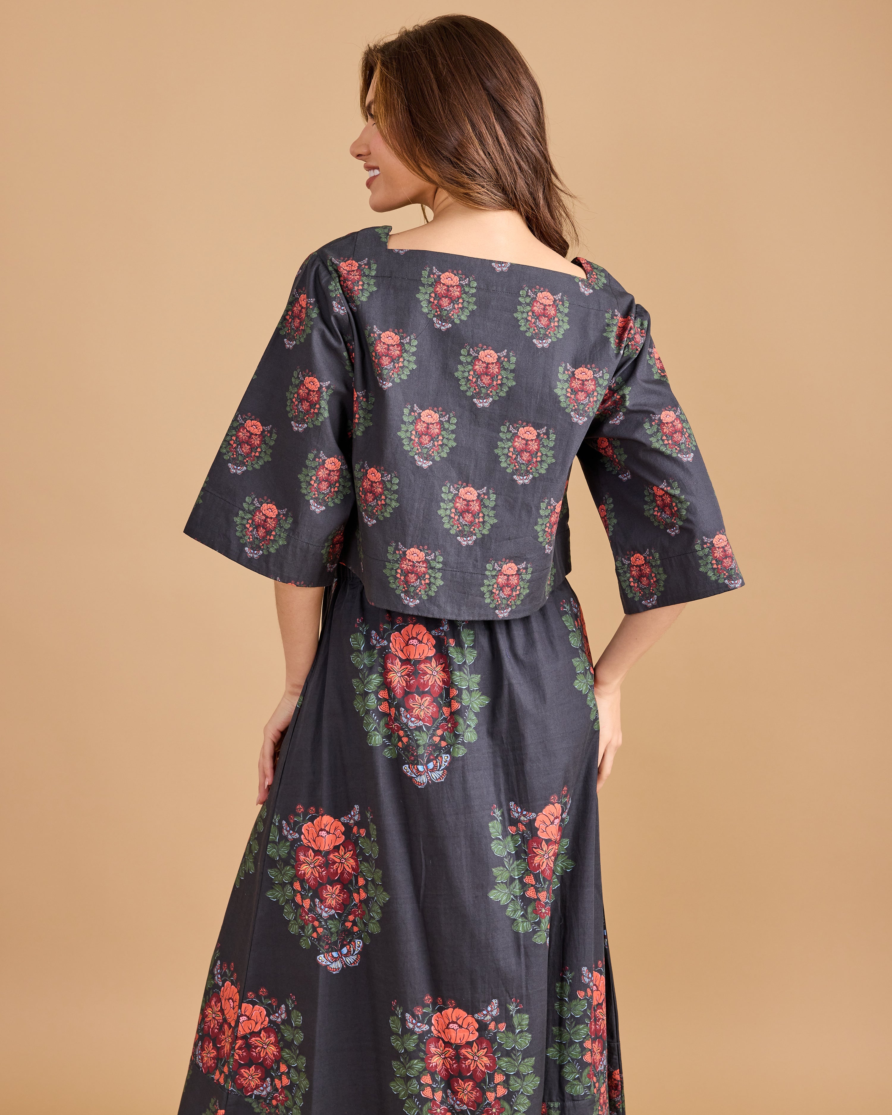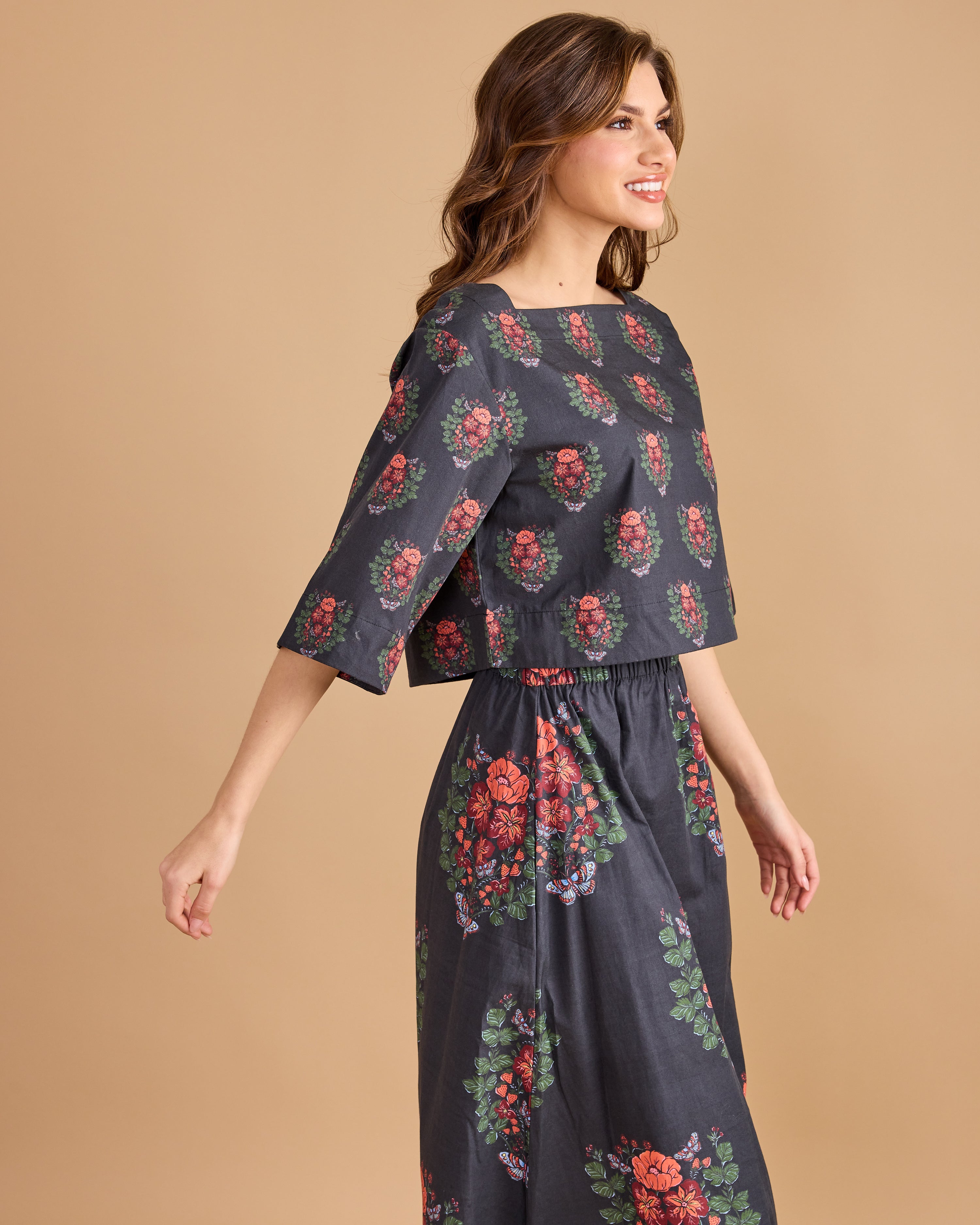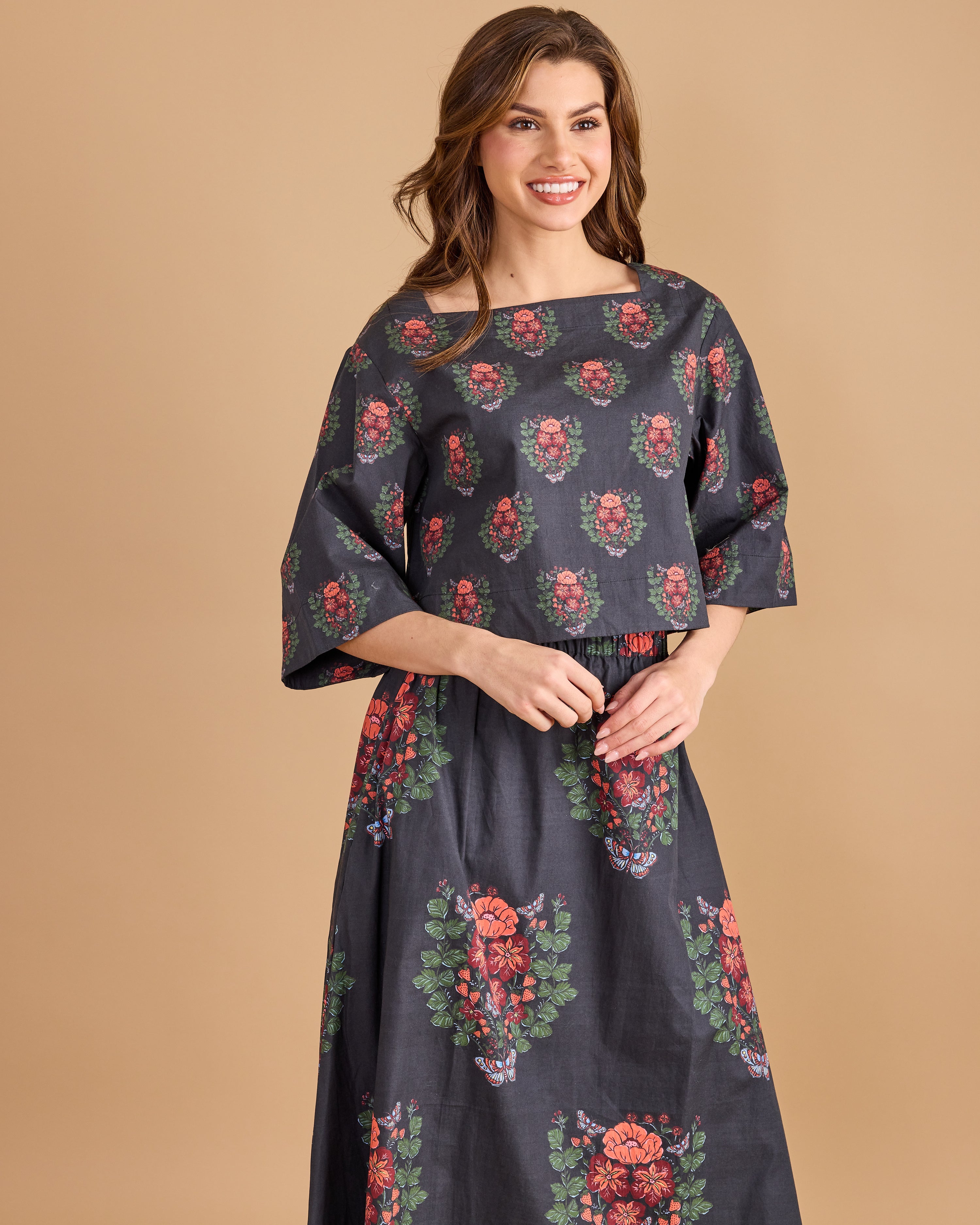 The Angie Top is a modern take on a timeless silhouette. Designed with a boxy, relaxed fit, it features wide three-quarter sleeves and a graceful bateau neckline for an effortlessly chic look. The bold floral print set against a dark backdrop makes it a standout piece, perfect for pairing with denim, skirts, or the matching Marisol Skirt for a coordinated set.