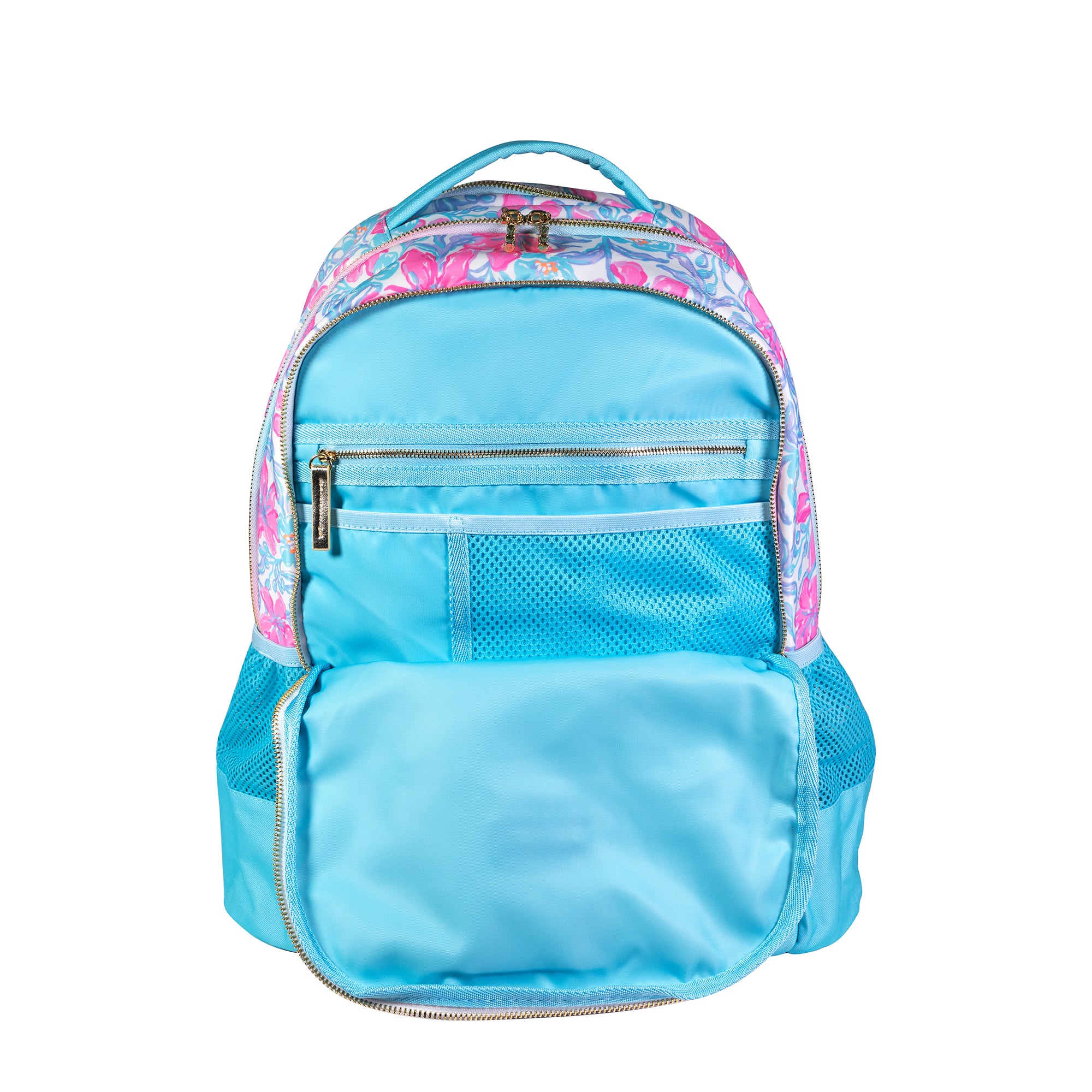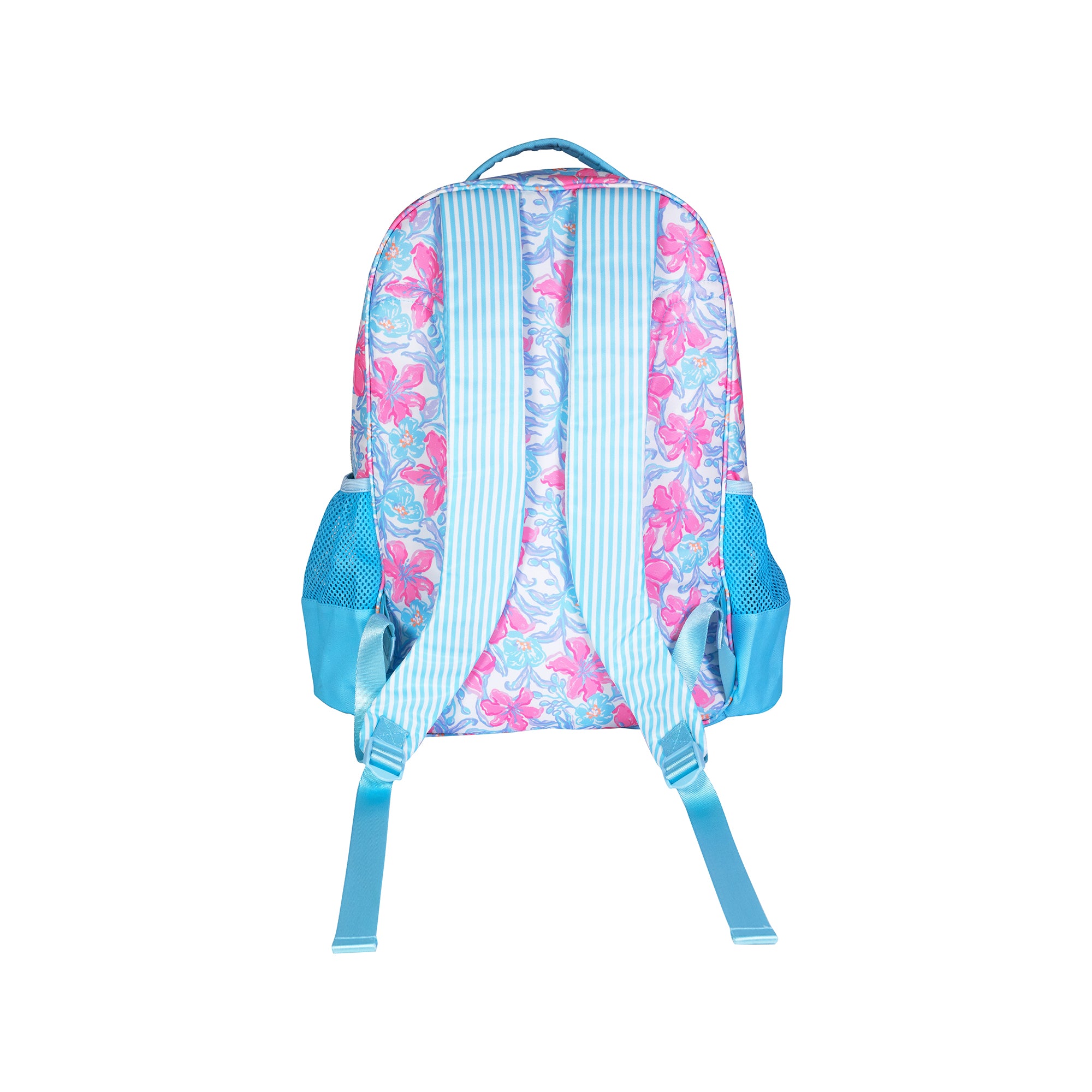We've got your back with this spacious backpack in Beachside Haven. This backpack boasts adjustable straps, mesh pockets, bamboo zipper pulls, interior and exterior pockets, and a gold logo plaque.
