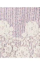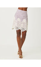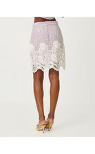- High-rise, A-line fit skirt with a back zipper, scalloped lace hem, and lace appliques.