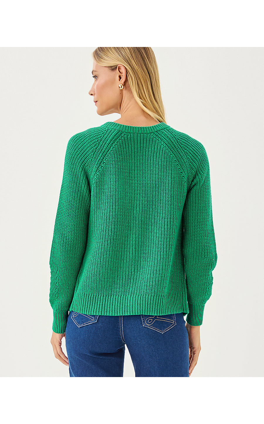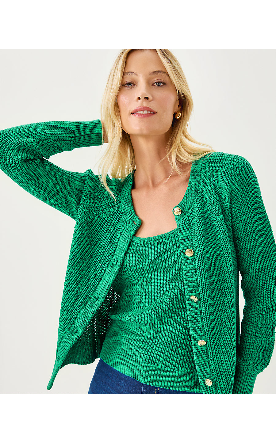 - Long sleeve, crew neck cardigan with buttons.