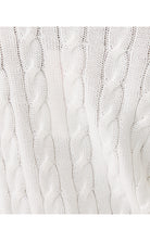 25.5" Long sleeve vneck cabled cardigan with 2 pockets, striped trims and 5 buttons at cross front.