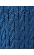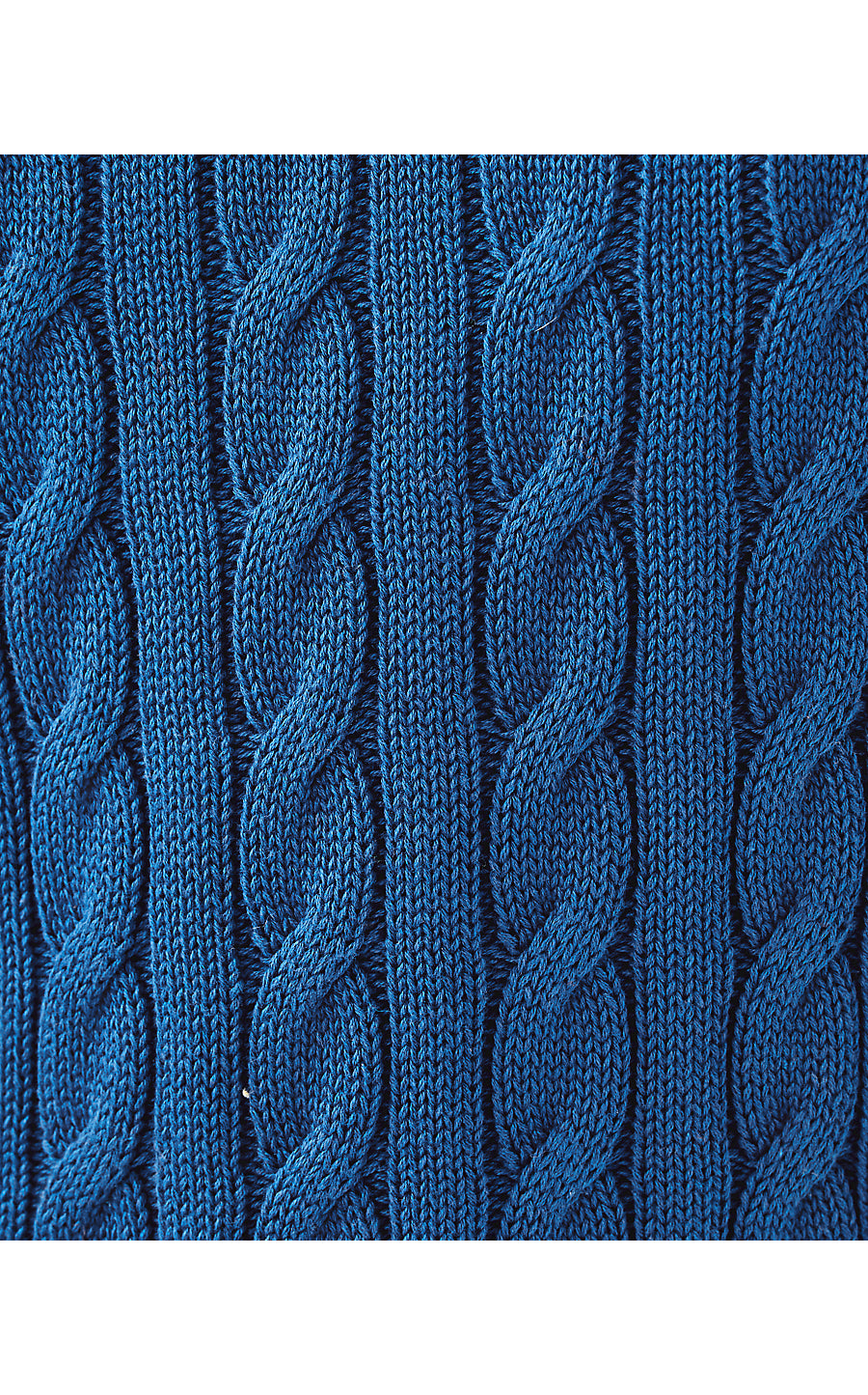 • Straight fit, high crew neck, cable sweater with striped trims.