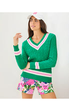 • Straight fit, v-neck, cable knit sweater with stripe details.