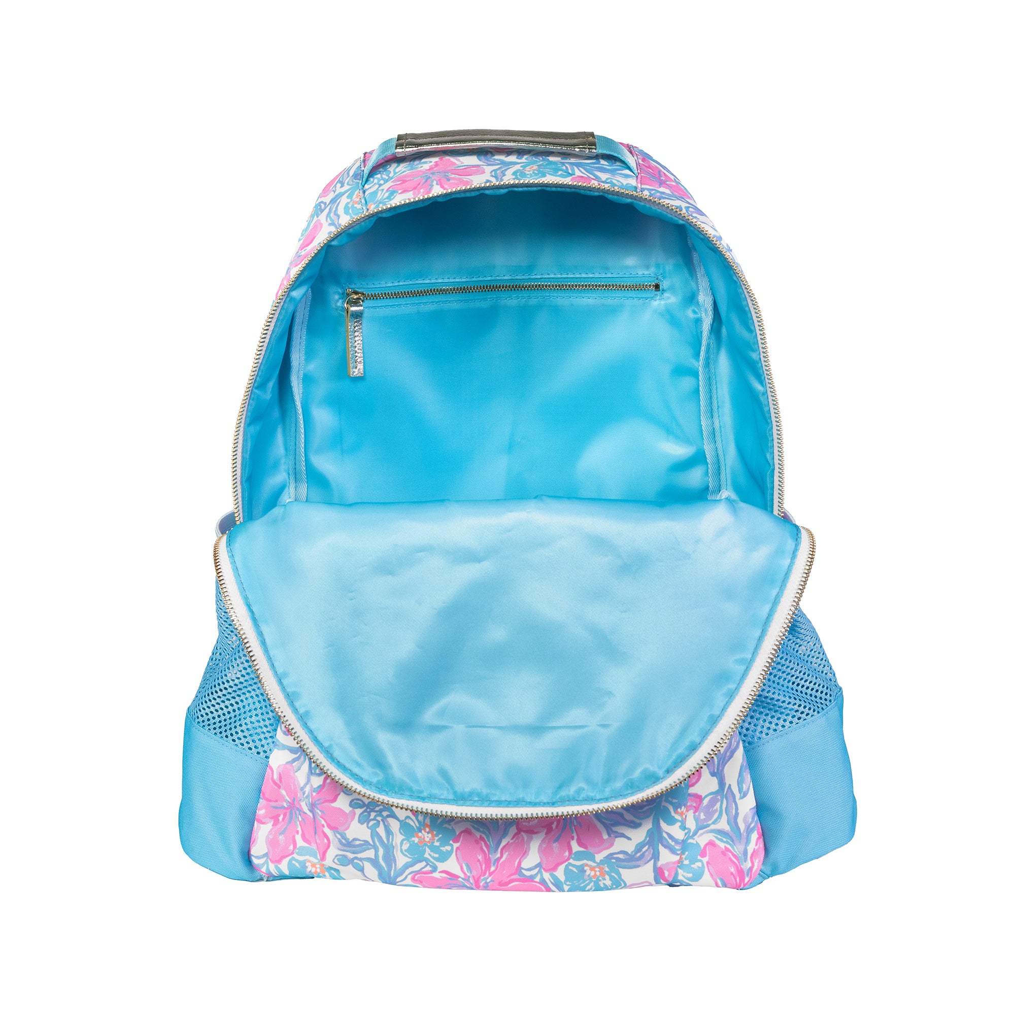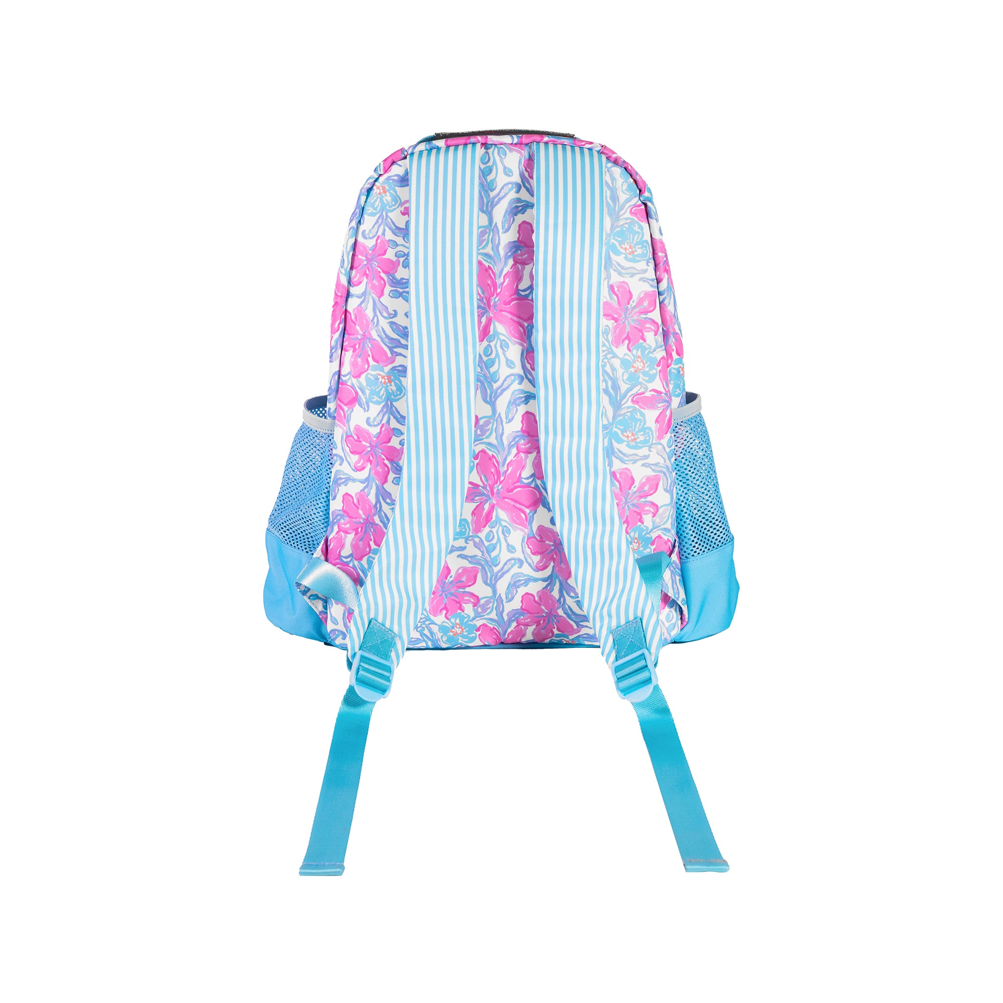 We've got your back with this spacious backpack in Beachside Haven. Sized especially for children, this backpack boasts adjustable straps, mesh pockets, bamboo zipper pulls, interior and exterior pockets, and a gold logo plaque.
