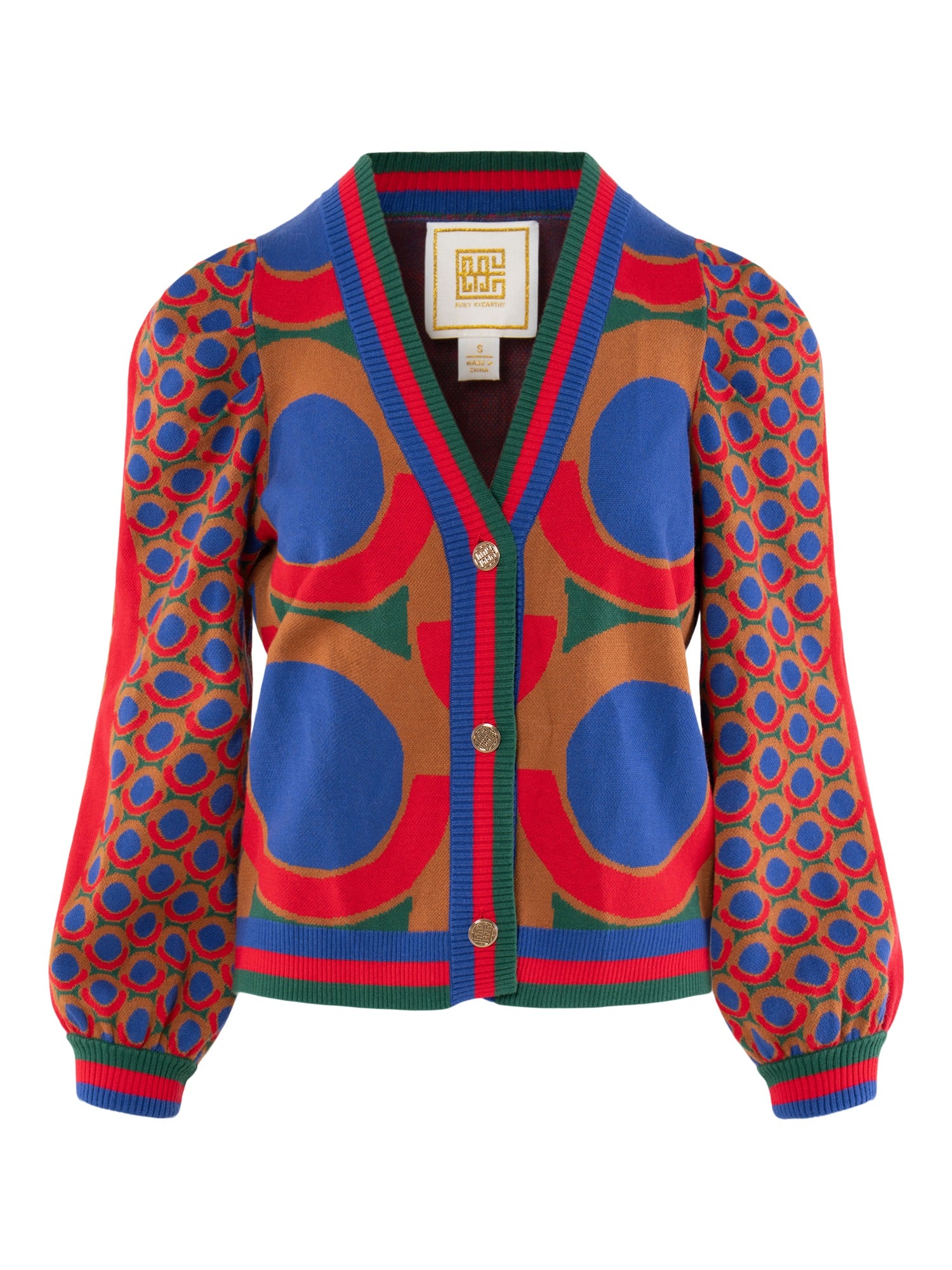 The Clara Cardigan in Mod features a signature gold button front closure, subtle blouson sleeves, and a slightly tailored fit for a polished yet playful silhouette. The bold mod print, inspired by vintage Italian style, brings a vibrant retro touch that makes a statement. Pair it with the matching Teddy Crop Trouser for a cozy, coordinated set that’s equal parts chic and comfortable.