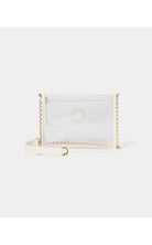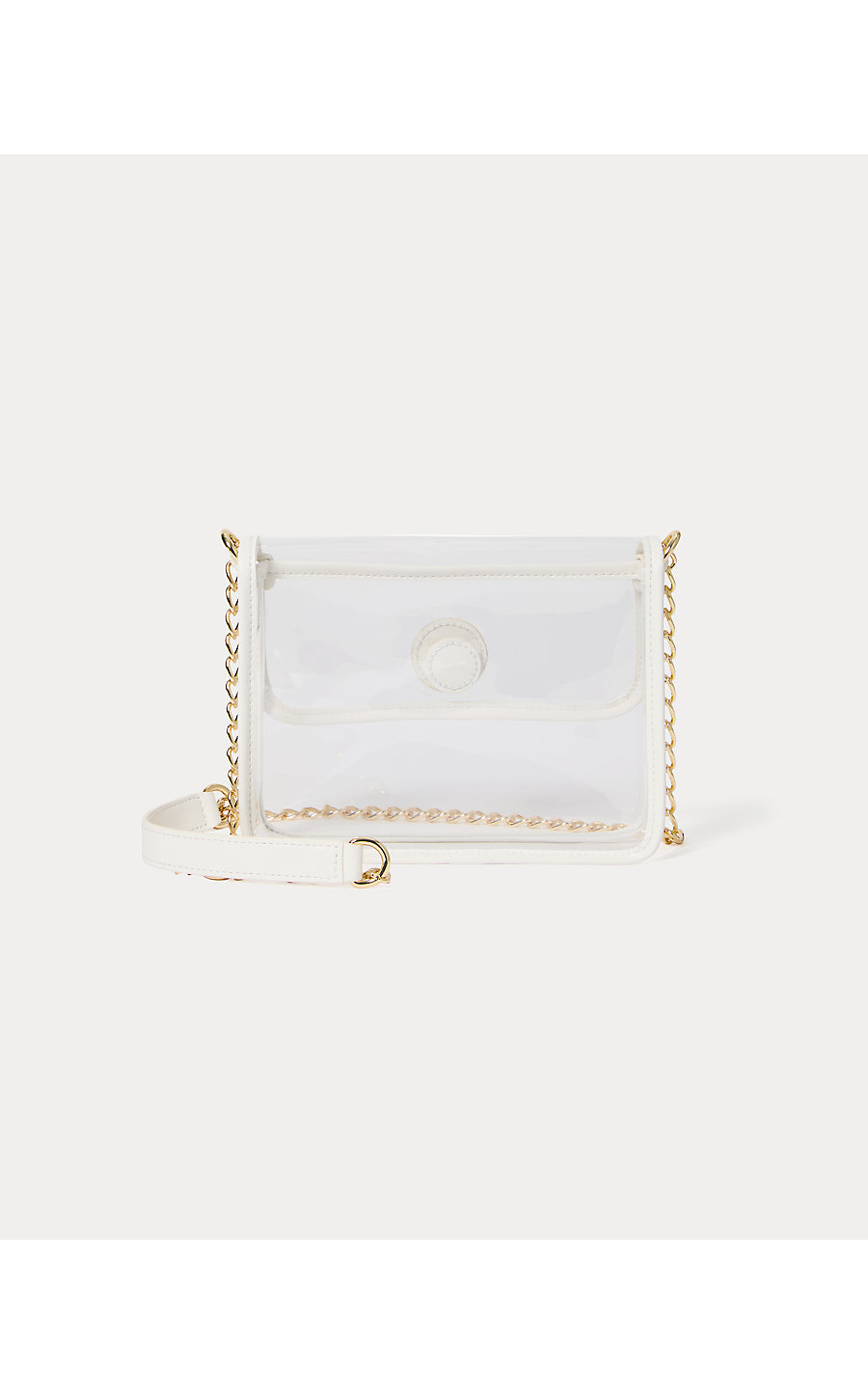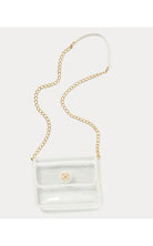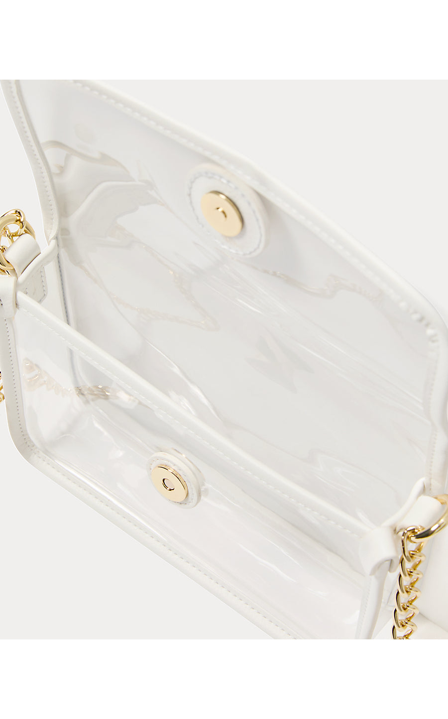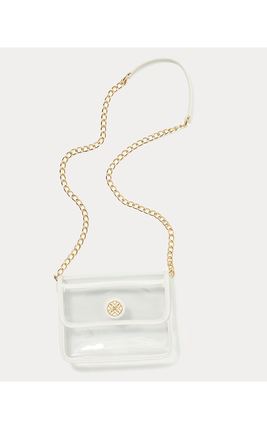 - Clear crossbody bag with a magnetic snap closure and a gold metal chain crossbody strap.
