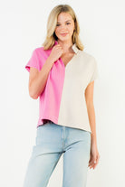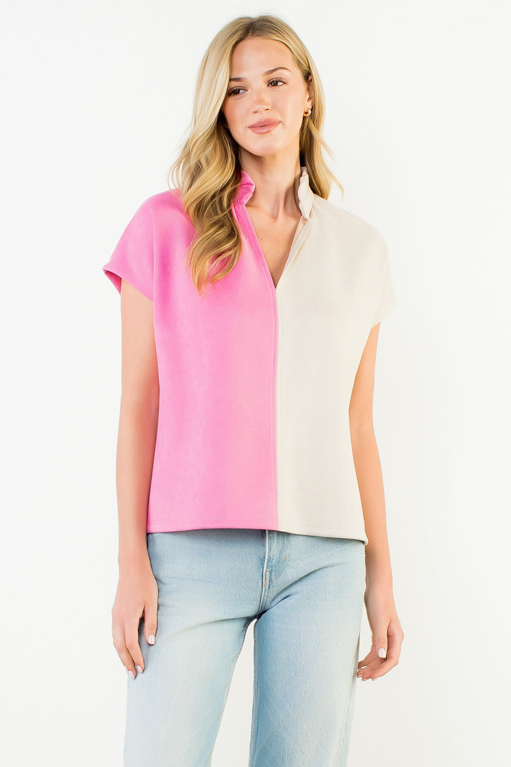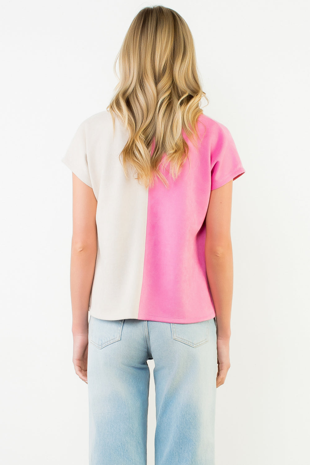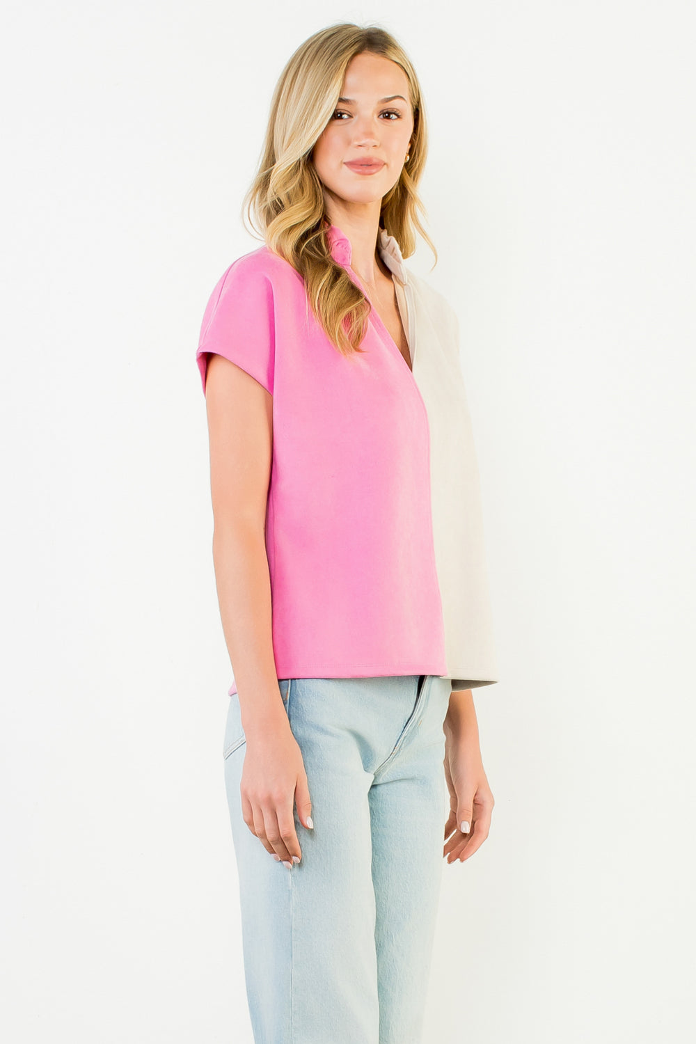 Add a modern twist to your everyday style with this soft suede top, designed in a striking two-tone color block of bubblegum pink and neutral cream. The relaxed silhouette, short sleeves, and open collar neckline make it effortlessly polished yet comfortable. Pair with your favorite denim for a casual look or tuck into tailored trousers for an elevated finish.