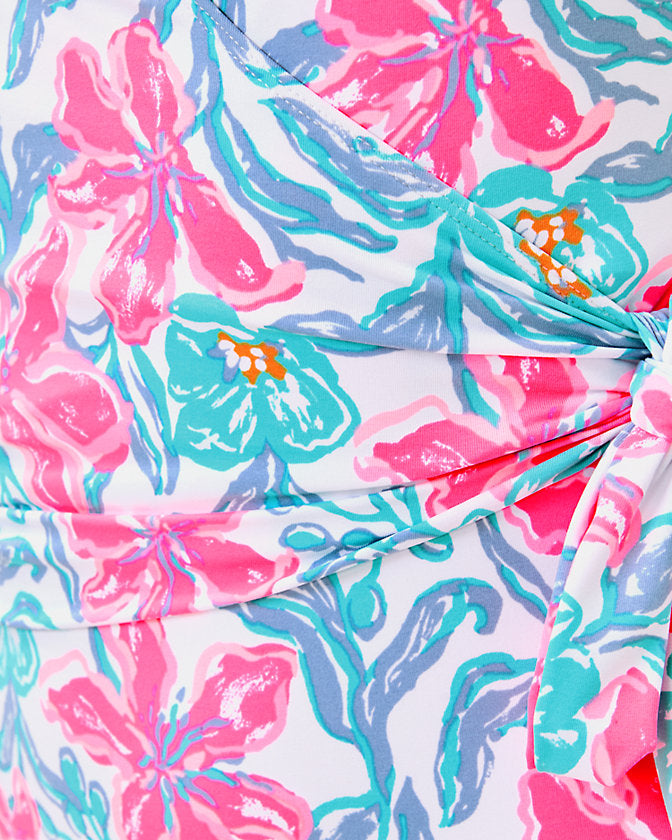 - One-piece, wrap swimsuit with an adjustable tie detail at the hip.