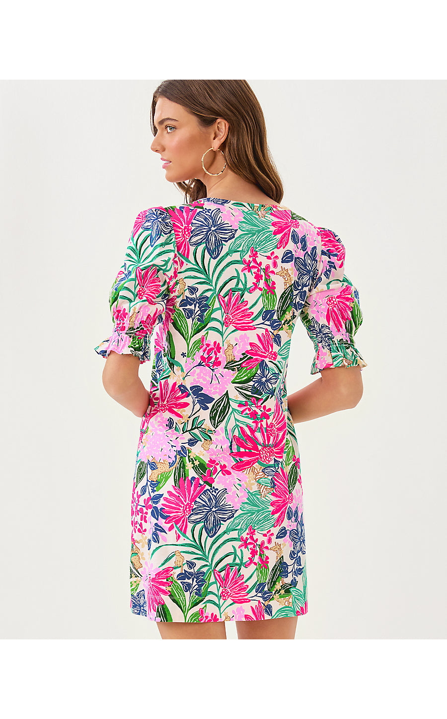 - Easy fit dress with gold buttons and smocked sleeves with ruffle details.