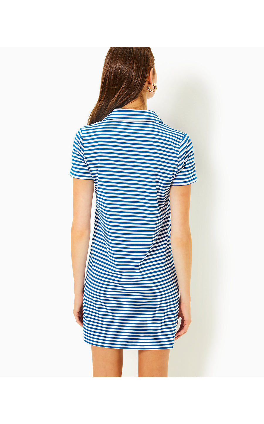 - Straight fit, short sleeve, collared popover shirtdress with an overlapping placket, small chest pocket, and logo hardware at the hem.