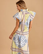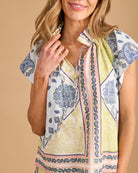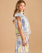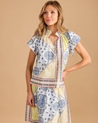 Lightweight and breezy sleeveless top with a pastel bandana print, flutter sleeves, and a ruffle-trimmed collar with front ties. Stylish on its own or paired with the matching skirt.