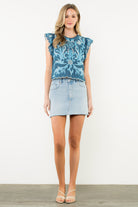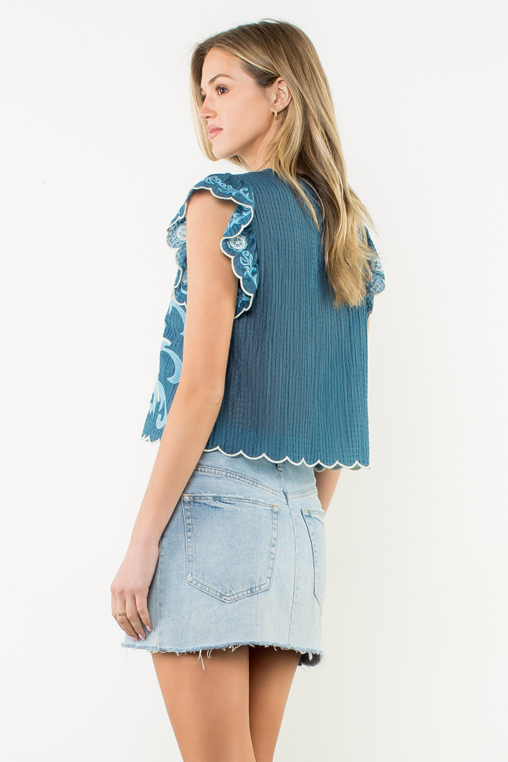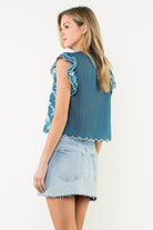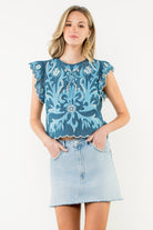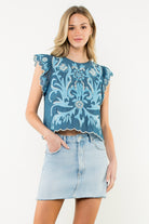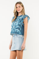 Make a statement in this stunning embroidered cap sleeve top! Featuring intricate sky blue embroidery over a rich denim-blue base, this top exudes boho charm with a touch of elegance. Scalloped edges, flutter sleeves, and a floral motif add a feminine finish, while the cropped length pairs perfectly with high-waisted jeans or a skirt for an effortlessly chic look. A standout piece for brunch dates, summer outings, or festivals!