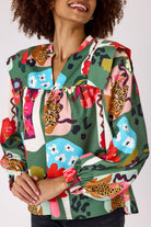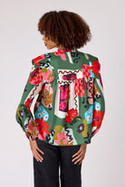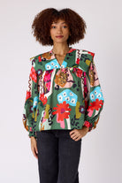 Bold and playful, the Gaines Top brings instant joy to your wardrobe. Designed with a relaxed silhouette, this statement blouse features voluminous long sleeves, a flattering v-neckline, and an oversized sailor-inspired collar for a modern twist. The vibrant abstract floral print mixes bright pops of red, turquoise, and pink against an earthy green backdrop—perfect for pairing with denim or tailored trousers. Effortlessly chic and comfortable, the Gaines Top is made for days when you want your outfit to do the talking.