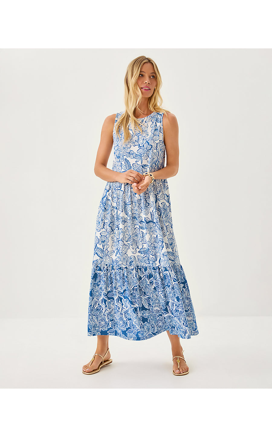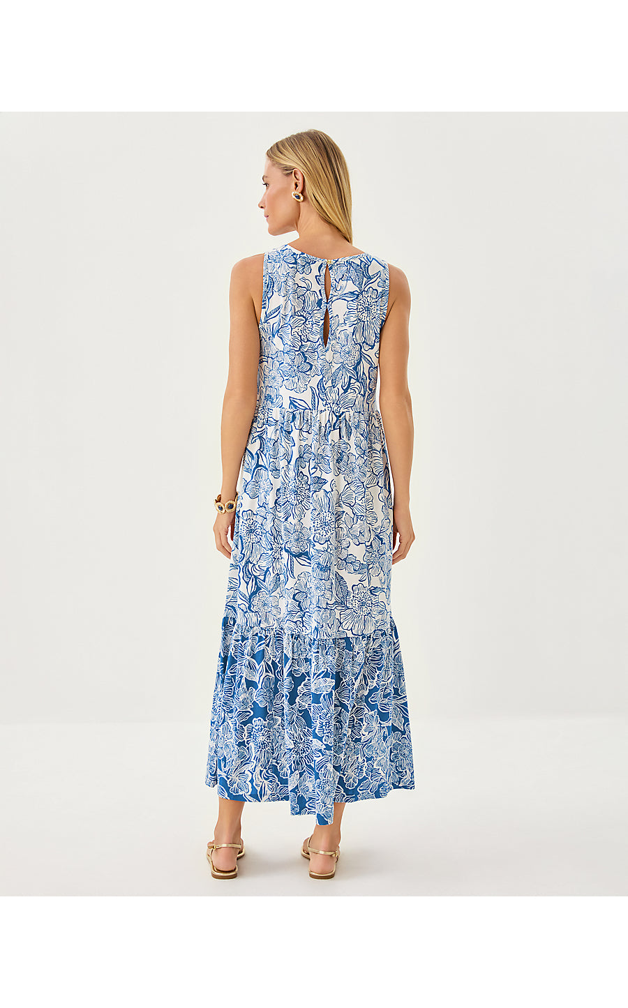 - Swing fit, tiered midi dress with a boat neckline and back keyhole detail.