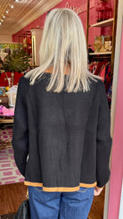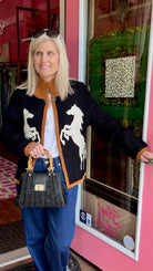 A statement-making layer with timeless charm, this equestrian-inspired knit cardigan features bold ivory horse motifs on a deep black base. Detailed with warm camel trim and a front clasp closure, it’s the perfect blend of classic and playful style. Designed in a relaxed fit, this cozy cardigan pairs beautifully with denim or tailored trousers for an effortlessly chic look.