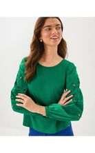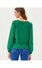 - Straight fit top with a scooped neckline and custom eyelet embroidery on the long blouson sleeves.