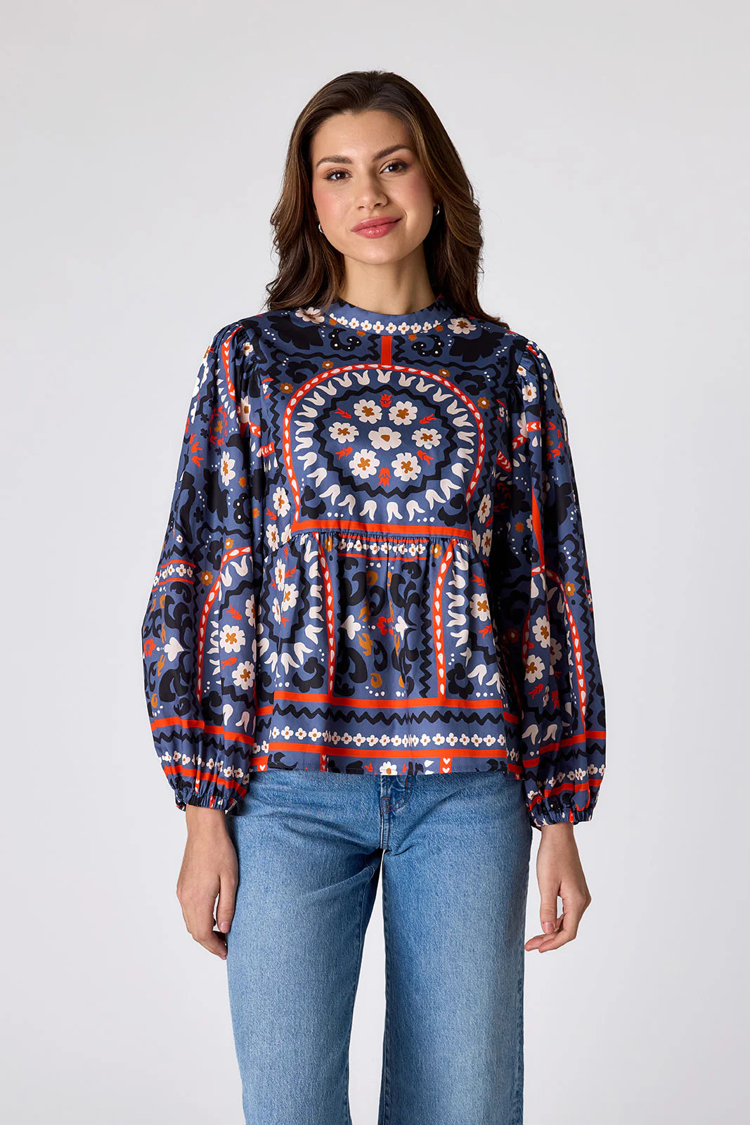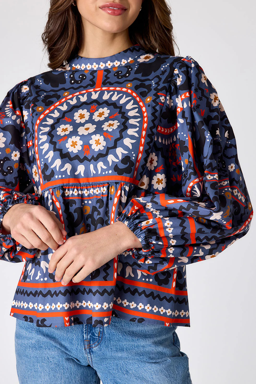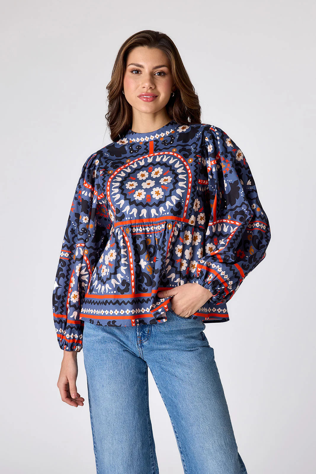 Meet the Jodi Blouse. Designed to turn heads, this flowy top features voluminous balloon sleeves, a chic mock-neck collar, and flattering waist details.