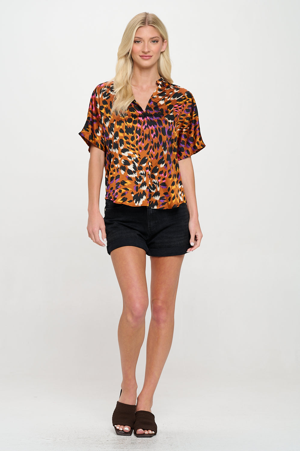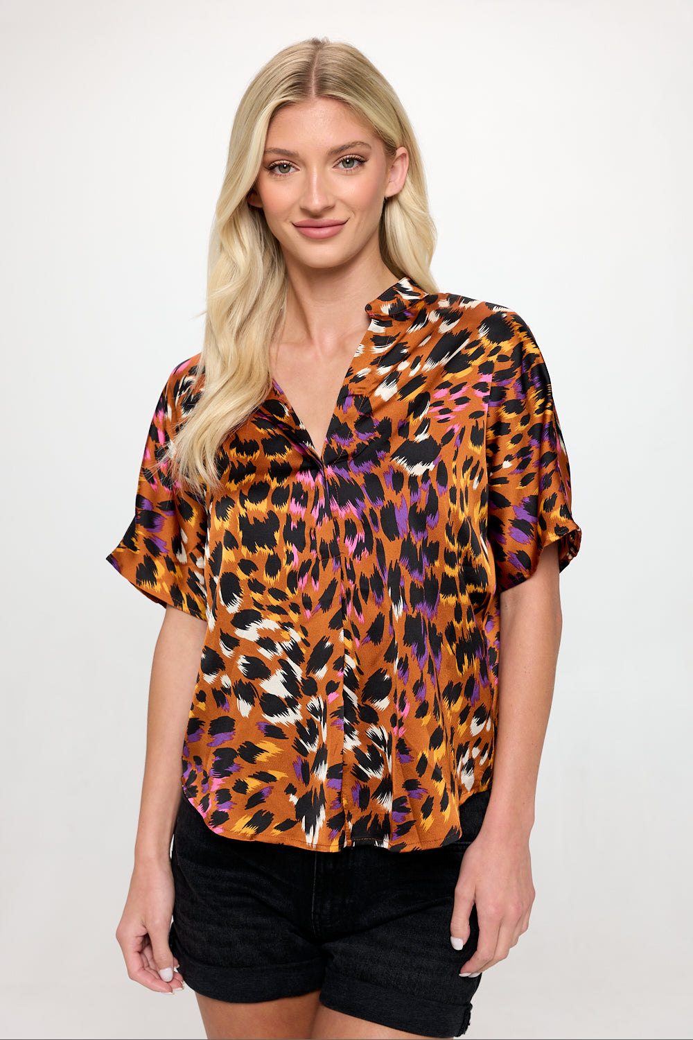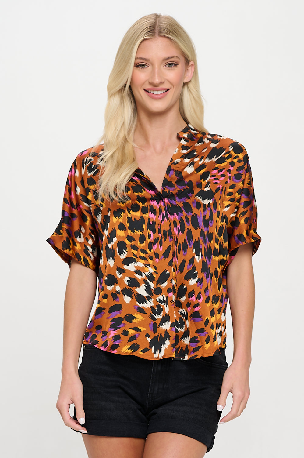 Unleash your wild side with this vibrant leopard print blouse, featuring a striking mix of orange, black, and purple hues. The short-sleeve design and relaxed fit make this top perfect for both casual outings and statement-making office wear. The lightweight fabric ensures comfort, while the bold print adds a touch of fierce style to any outfit. Pair it with jeans or tailored pants for an effortlessly chic look that stands out in any crowd.