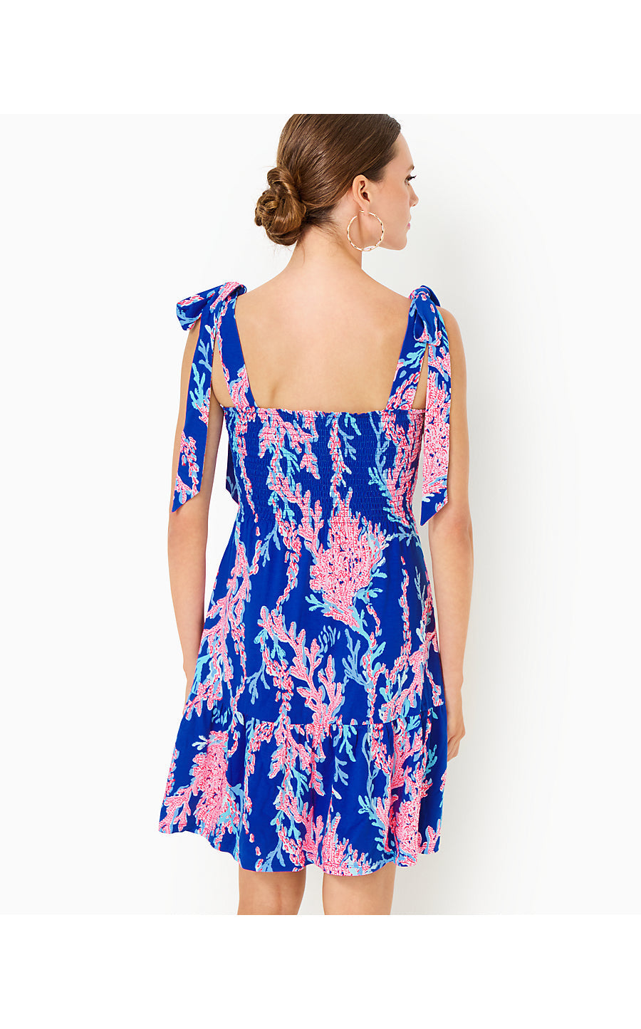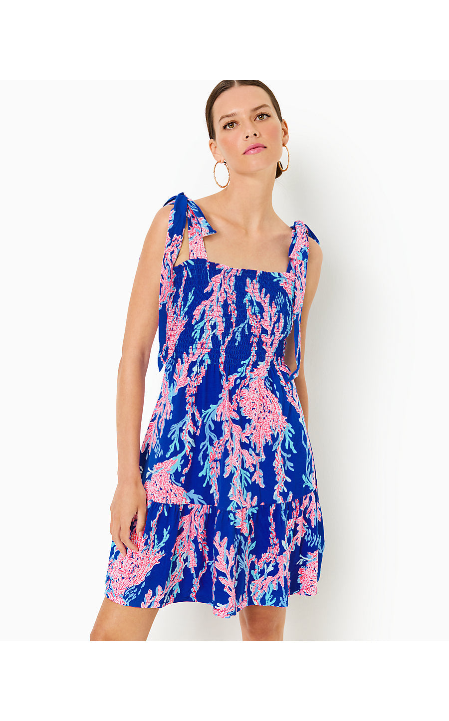 A smocked bodice and ruffled above-the-knee skirt create the fit-and-flare silhouette of our Kailua Dress. This prettily printed jersey style is topped off by functional tie straps.