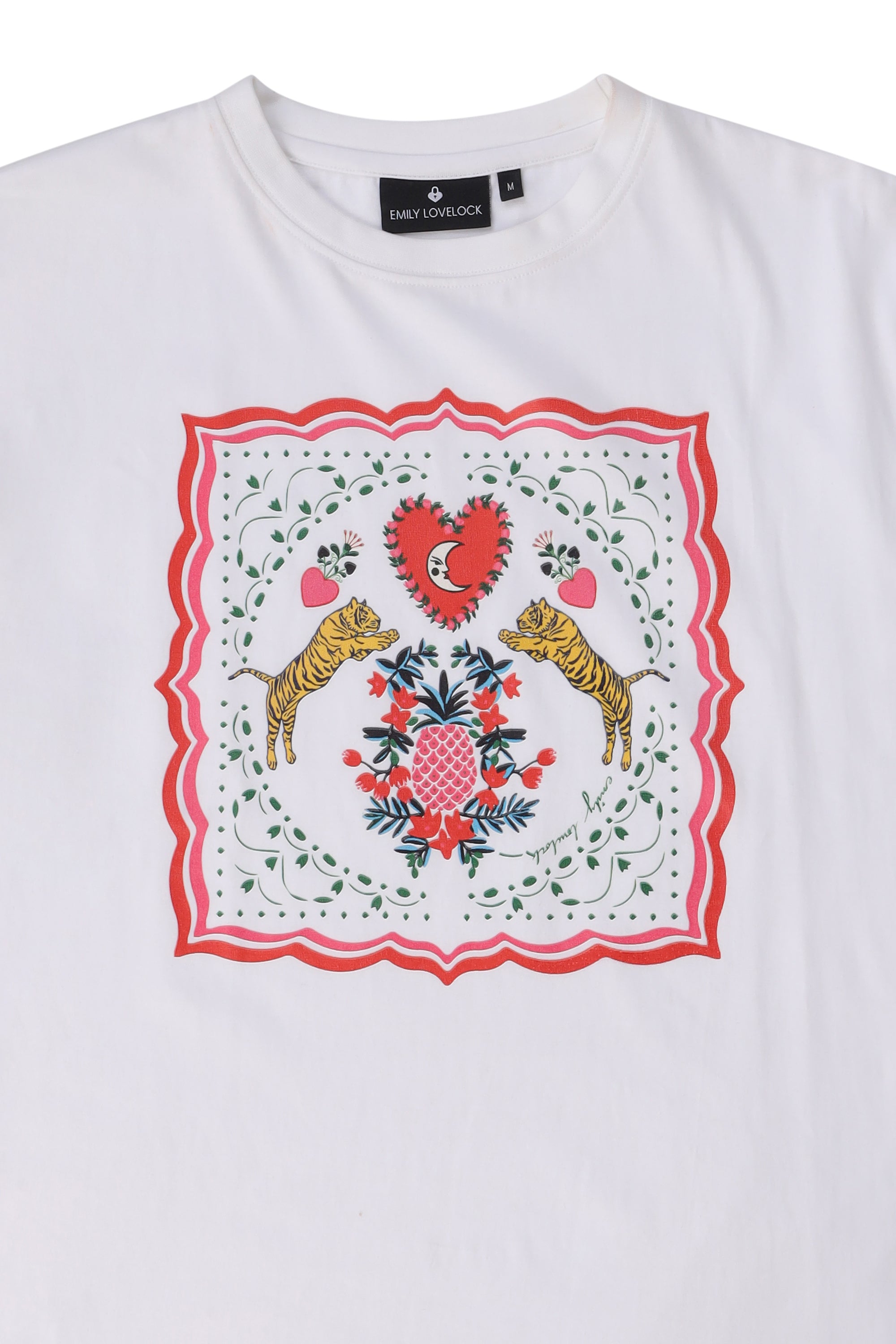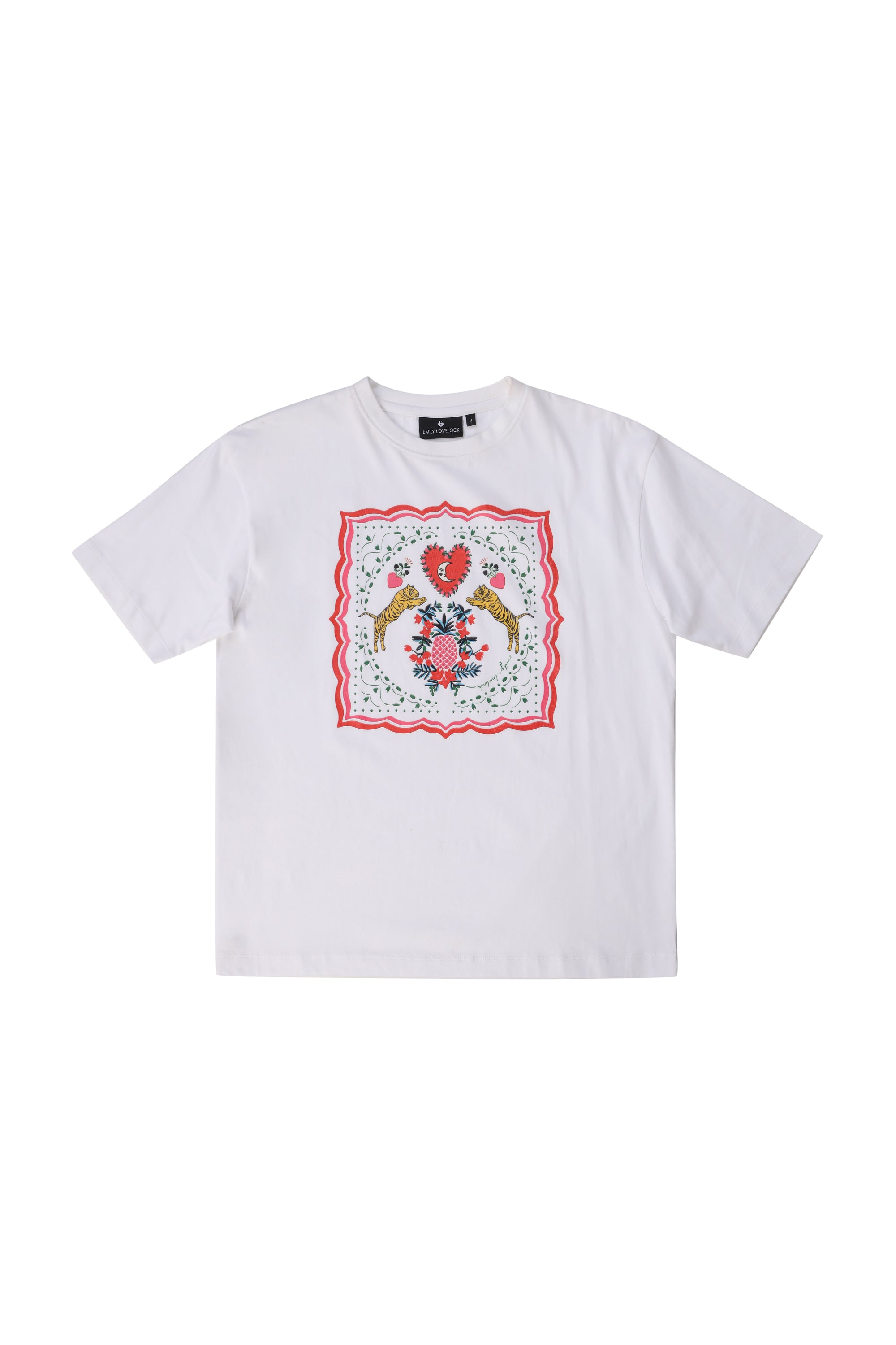 Make a bold yet effortless style statement with the Kate Print T-Shirt, a perfect fusion of artistry and comfort. Featuring a striking scarf-inspired graphic, this tee showcases an intricate design of two majestic tigers, a heart-shaped moon motif, and floral embellishments, all framed in a vibrant red border. The playful yet elegant illustration adds a unique touch to your everyday wardrobe.