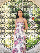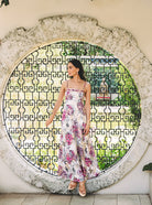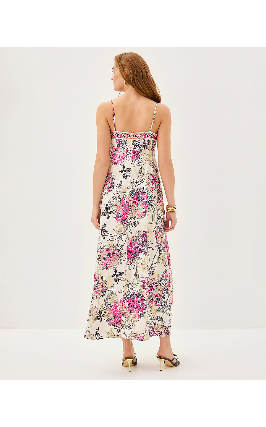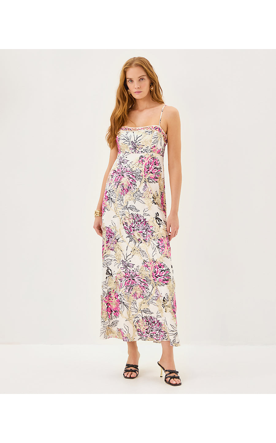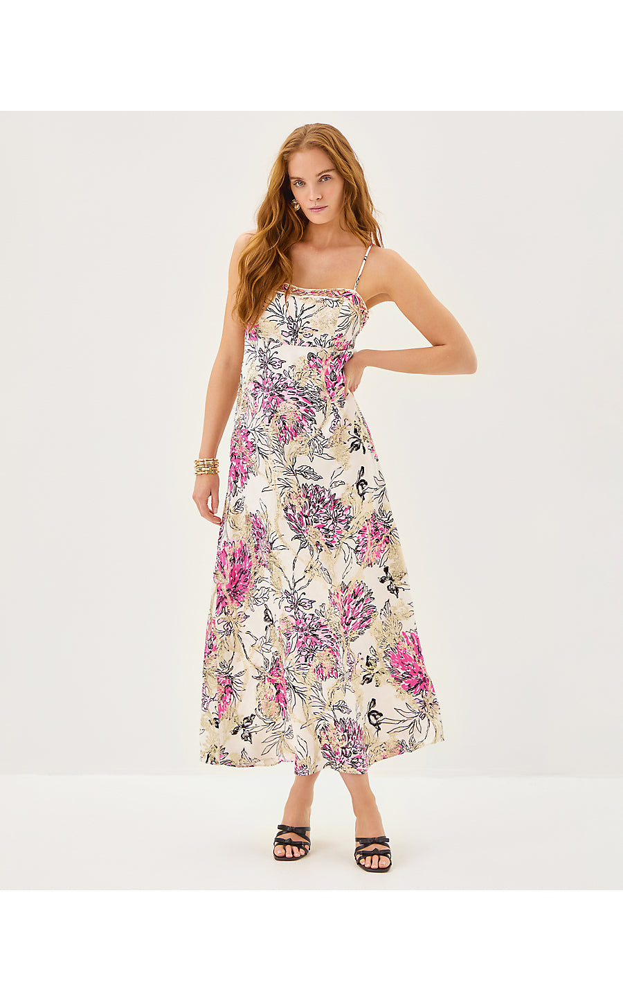 41" Fit and flare, ankle length maxi dress with adjustable spaghetti straps, beaded neckband, and empire waist.