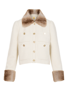 Classic sophistication meets modern luxury in the Lady Jacket. Crafted in a creamy textured fabric with a cropped silhouette, this statement piece features plush faux fur trim at the collar and cuffs for an effortlessly chic touch. Gold button details and front patch pockets complete the polished look, making it the perfect layering piece for cooler days or elegant evenings out.