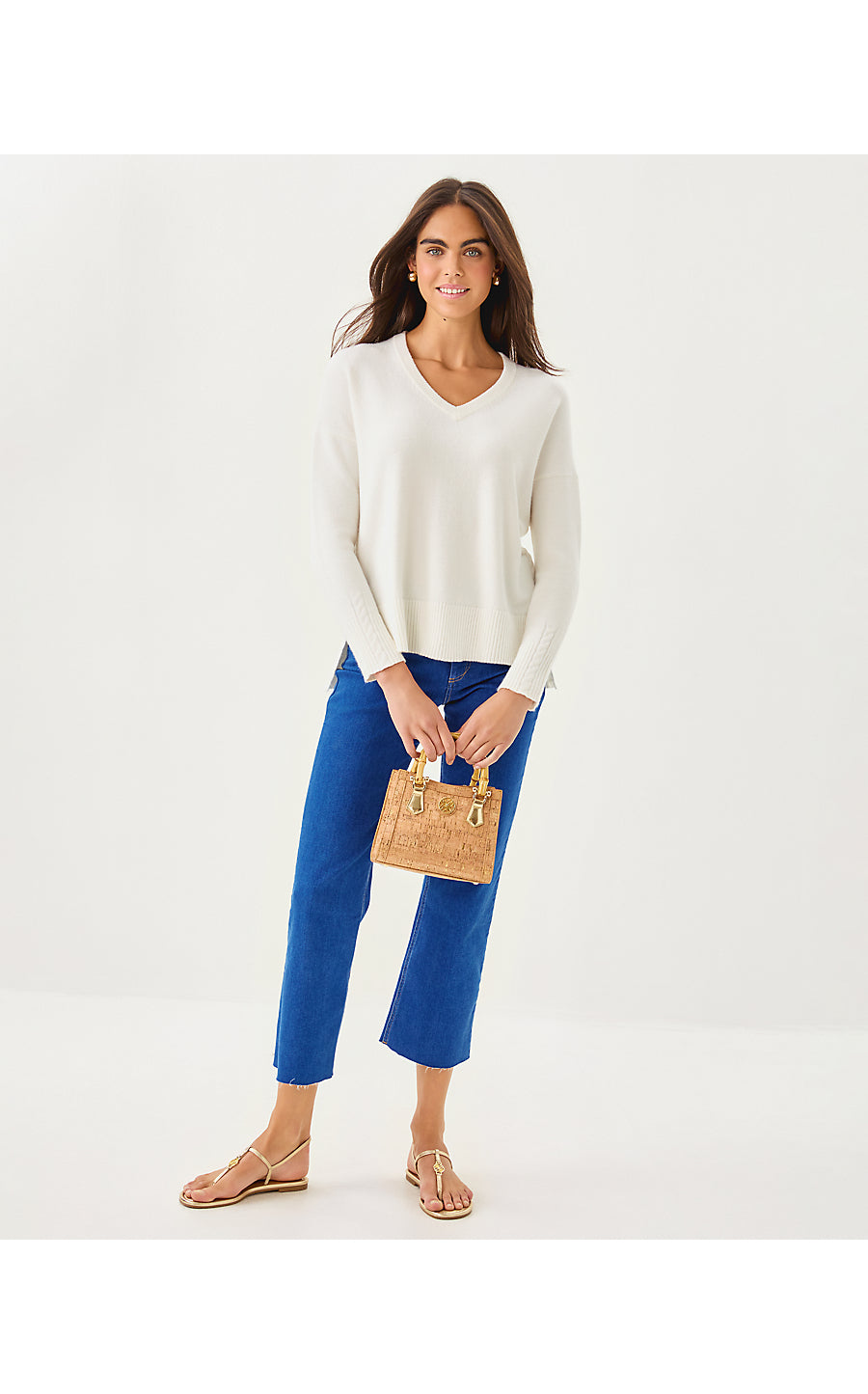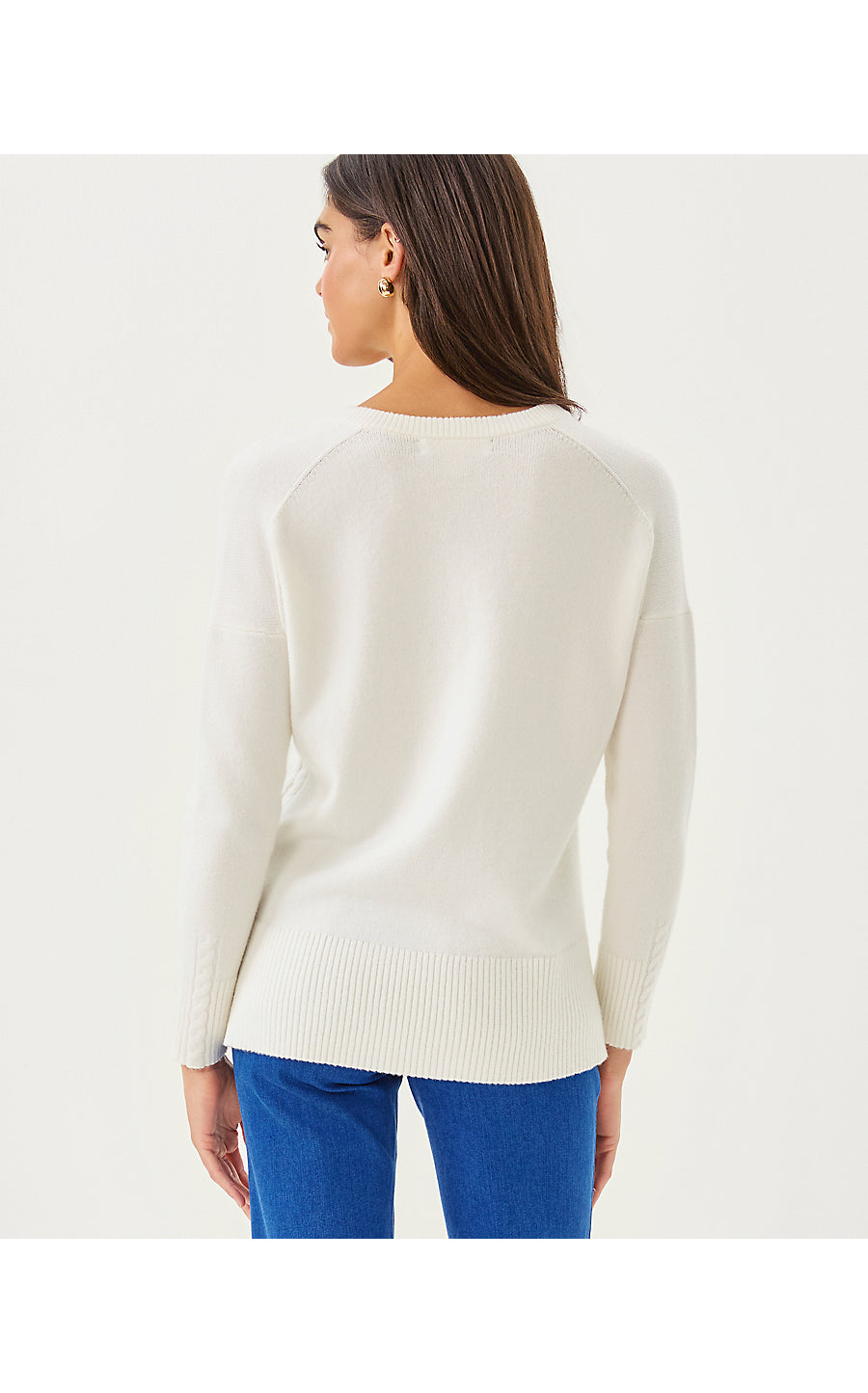 - Relaxed fit, drop shoulder, v-neck sweater with a high-low hem and cable stitch details at the side seams and sleeves.