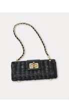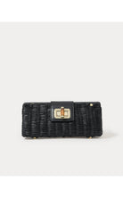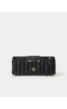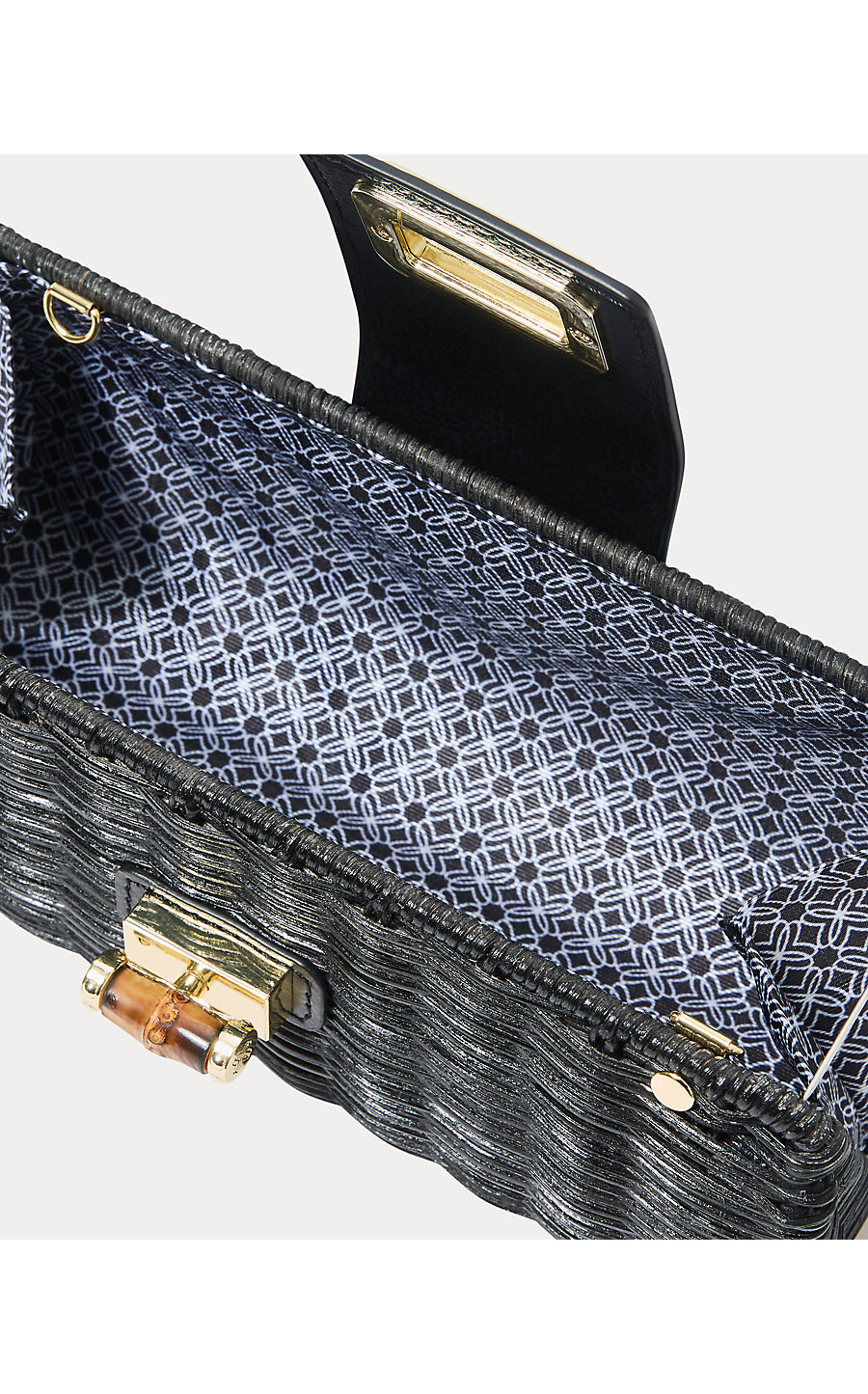 - Wicker clutch with a printed logo lining, natural bamboo turnlock closure, and a detachable gold metal chain strap.