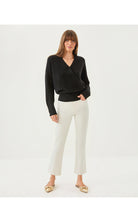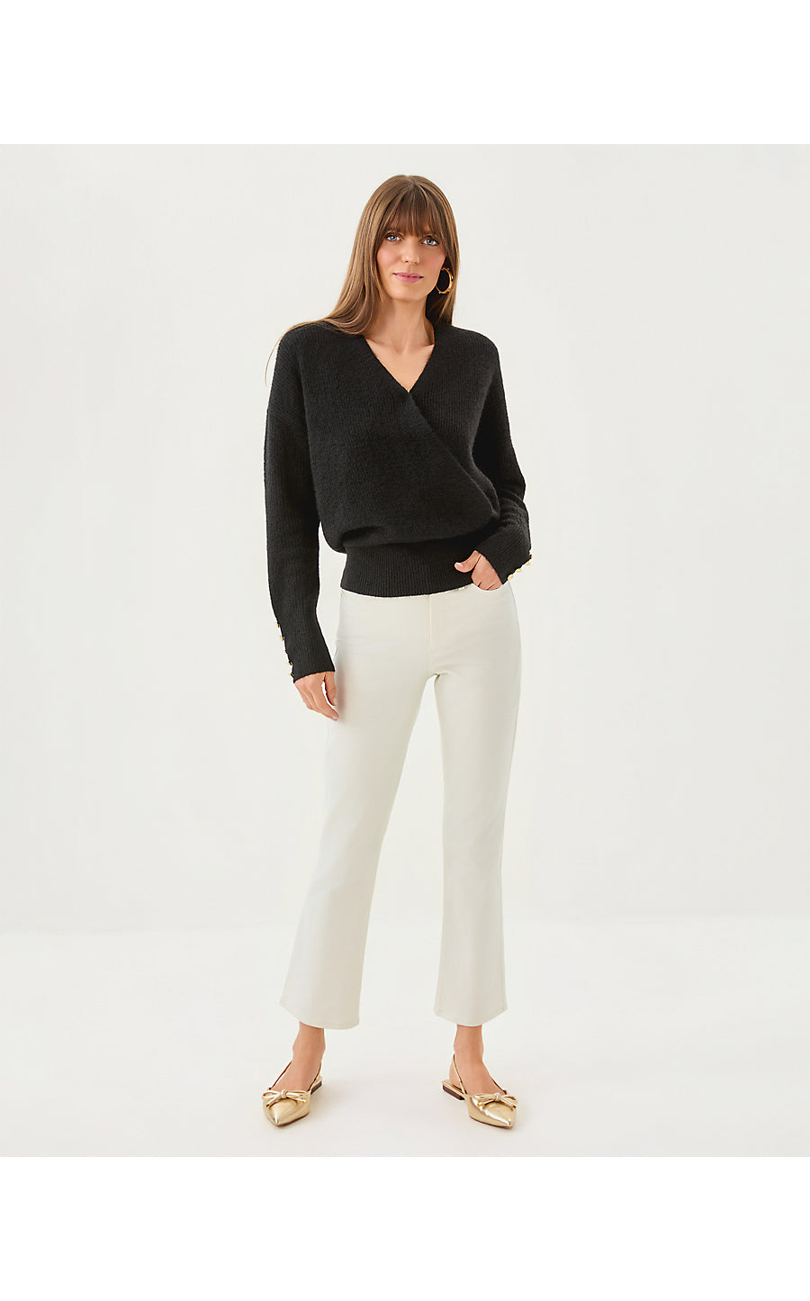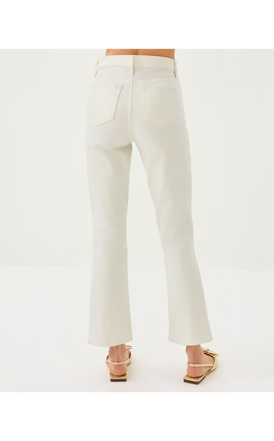 - High rise, crop flare, stretch coated denim jean with a straight fit.