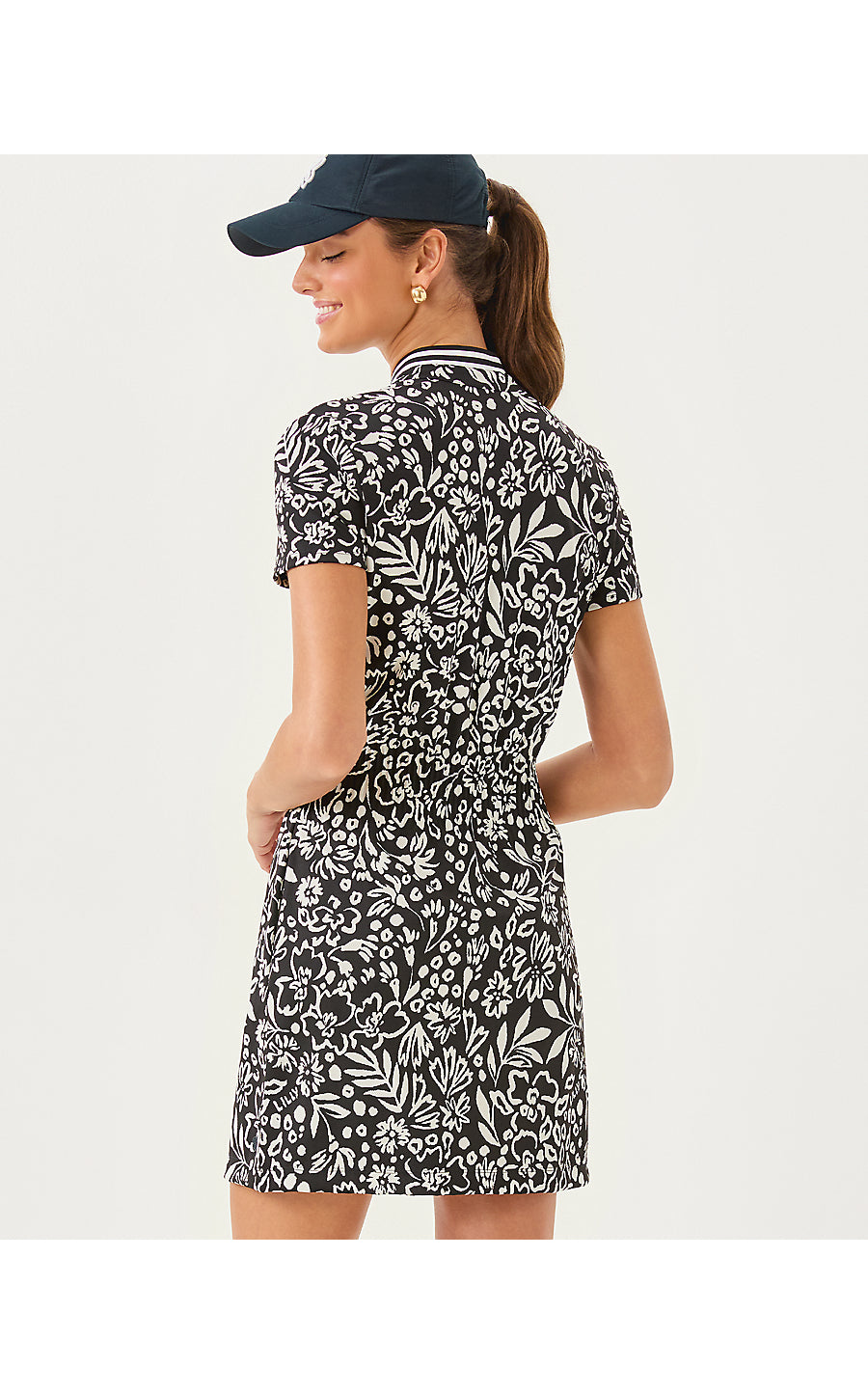 - UPF 50+ Luxletic® active polo dress with a rib collar, gold buttons, smocked waist, and side seam pockets. This style also features separate undershorts with pockets.