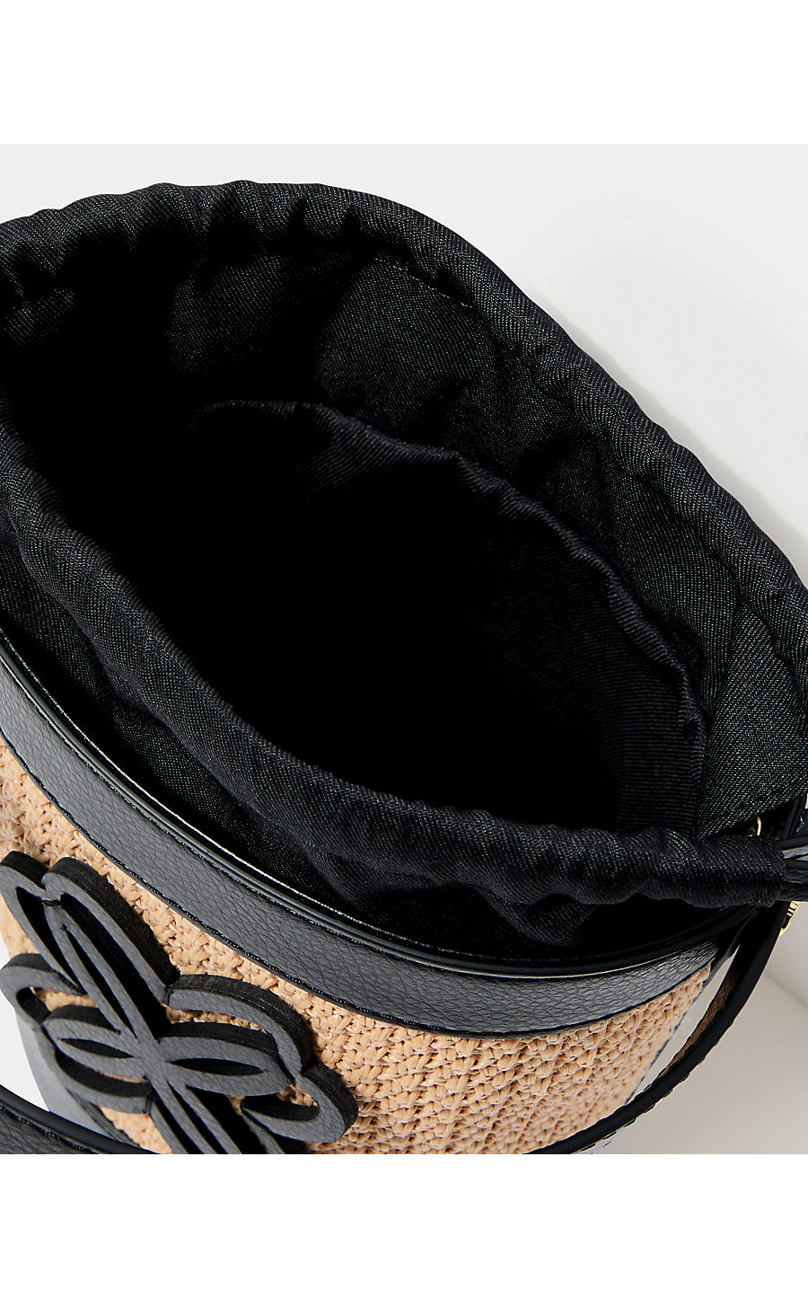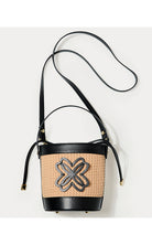 • Raffia bucket bag with a drawstring closure, cut-out logo detail, top handle, and detachable crossbody strap.