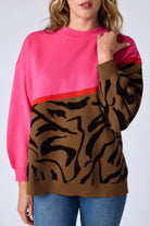 Make a bold statement with the Maxton Sweater, where cozy meets contemporary. This relaxed-fit knit features a striking colorblock design—vivid pink on top, separated by a pop of red, and grounded with a rich brown and black abstract zebra print. The crew neckline and ribbed cuffs add a classic touch, while the playful pattern keeps it fresh and modern. Perfect with denim or tailored pants, the Maxton Sweater is your go-to for effortless style with an edge.