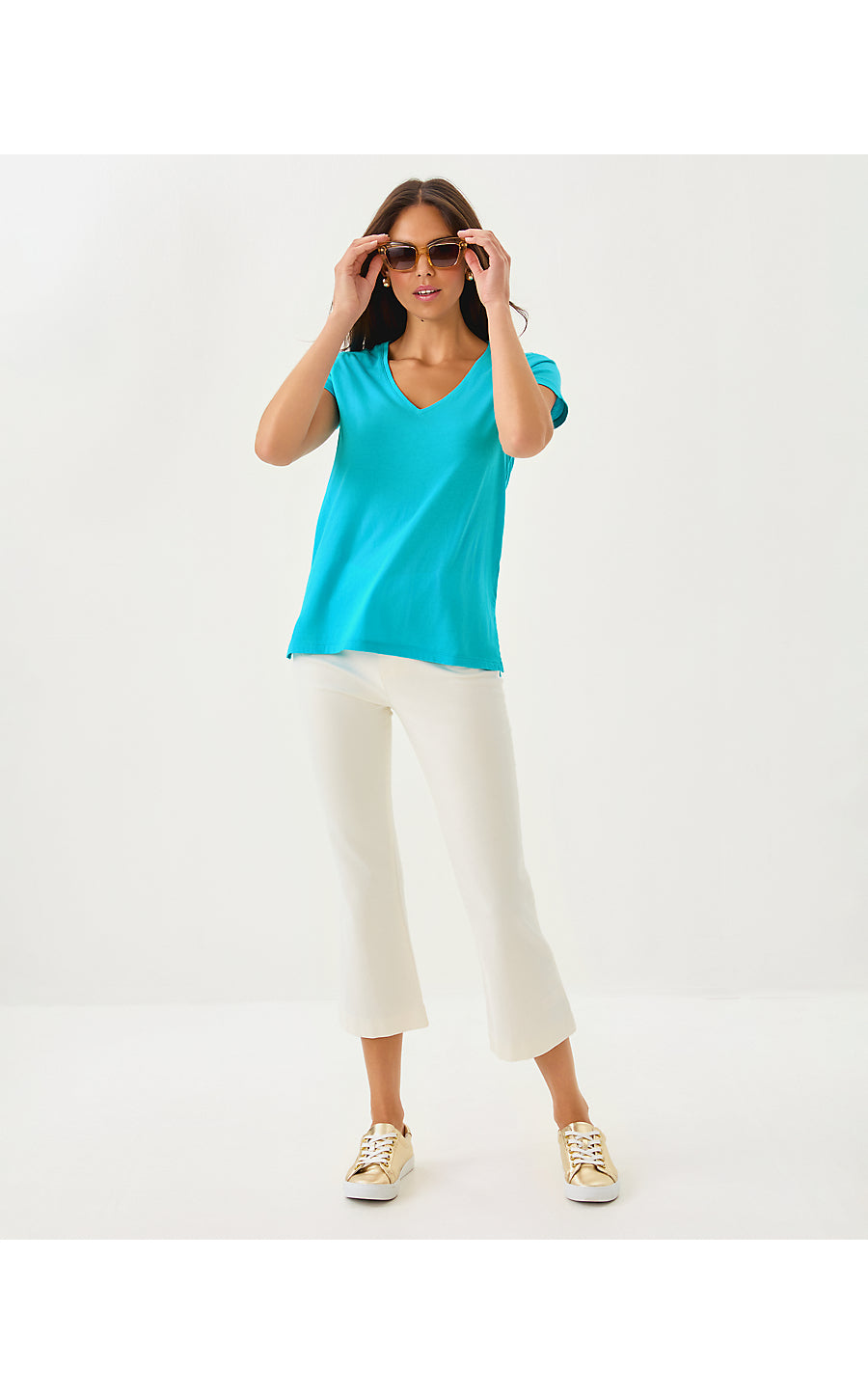 - Straight fit, short sleeve, pullover tee with a V-neckline.