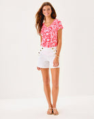 - Straight fit, short sleeve, pullover tee with a V-neckline.