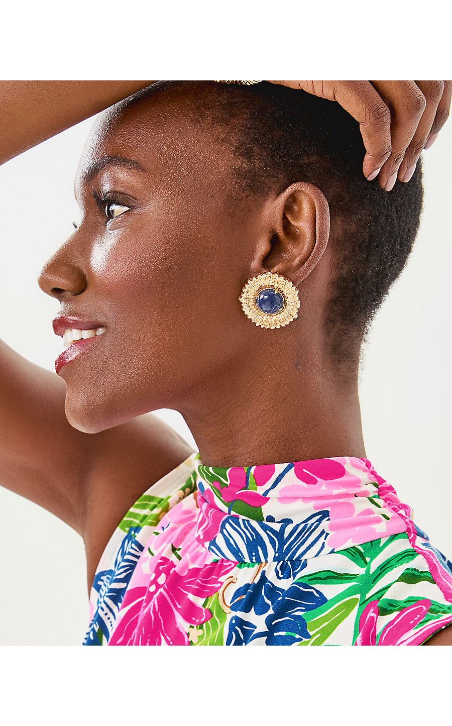 - Sunburst stud earrings with colored stones.