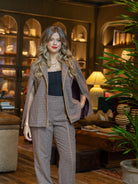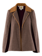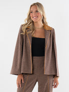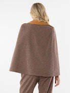 The Overlay Cape in Tweed is a statement layering piece designed with a classic lapel collar and cape-style sleeves that move gracefully to reveal the arms. Crafted from timeless wool tweed, this style is both cozy and refined, accented with vegan leather trim at the collar and edges for a modern finish. Gold stud details at the shoulders add subtle shine, while the deep burgundy lining offers a rich contrast. Pair it back with the matching Addison Jogger, or wear it as a standalone hero piece—this cape redefines outerwear with a touch of western-inspired flair.