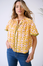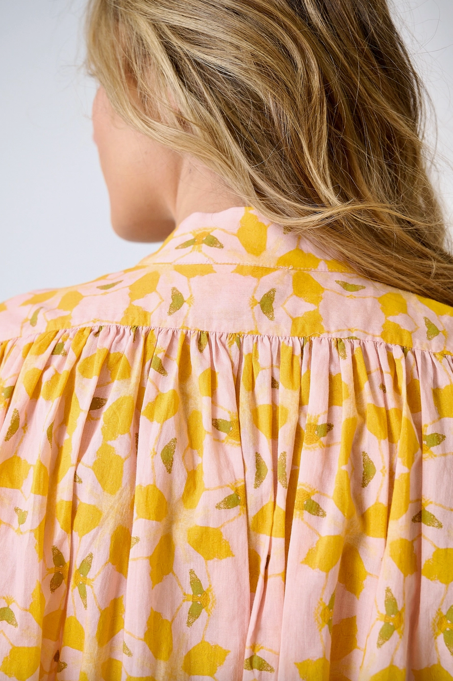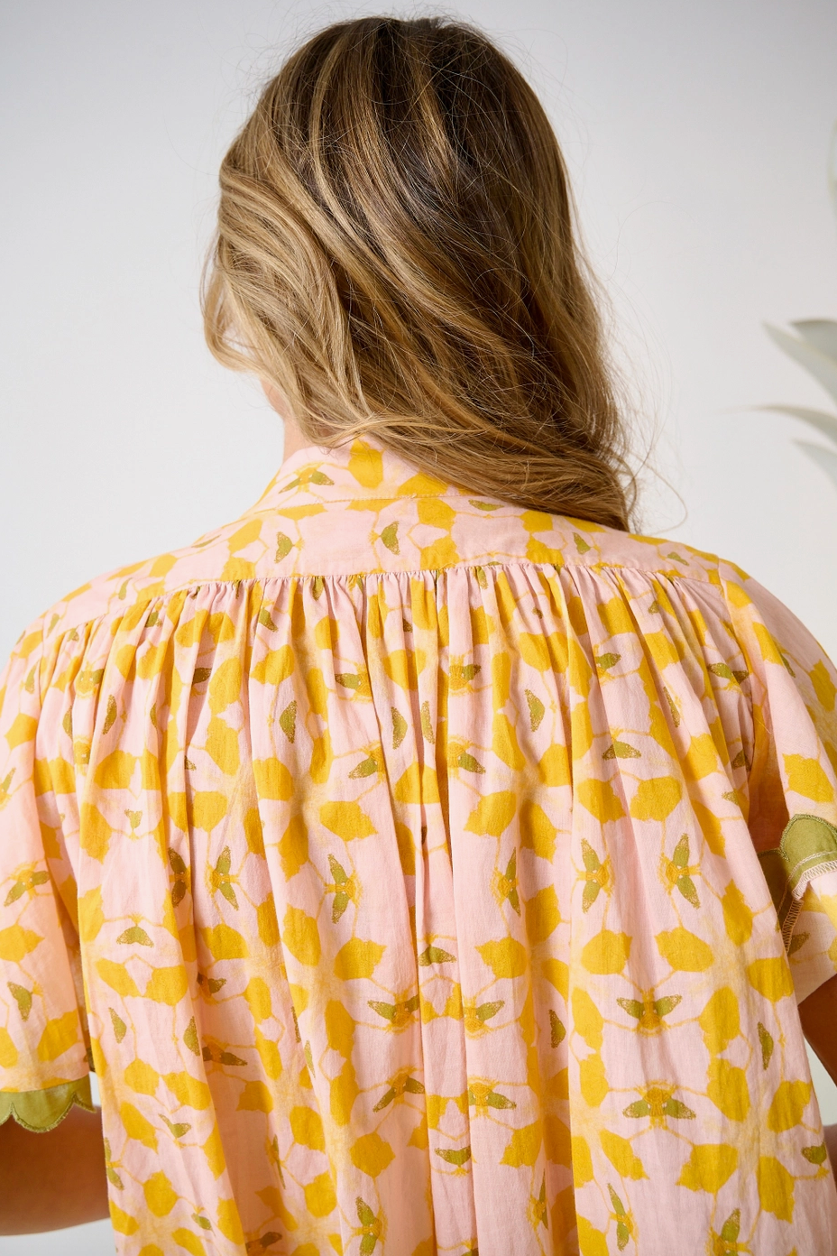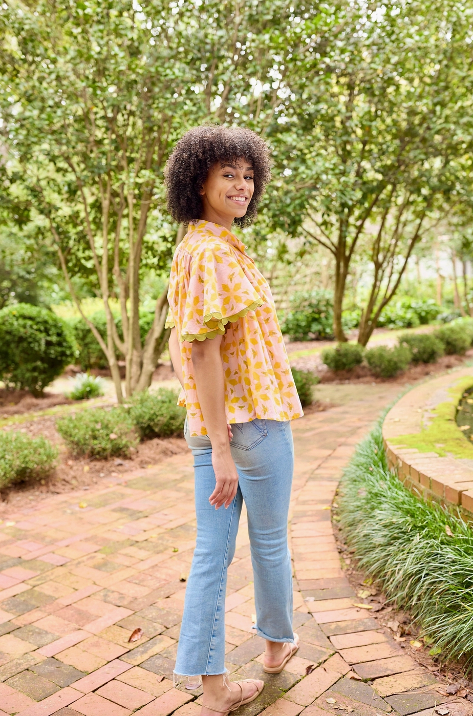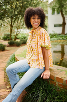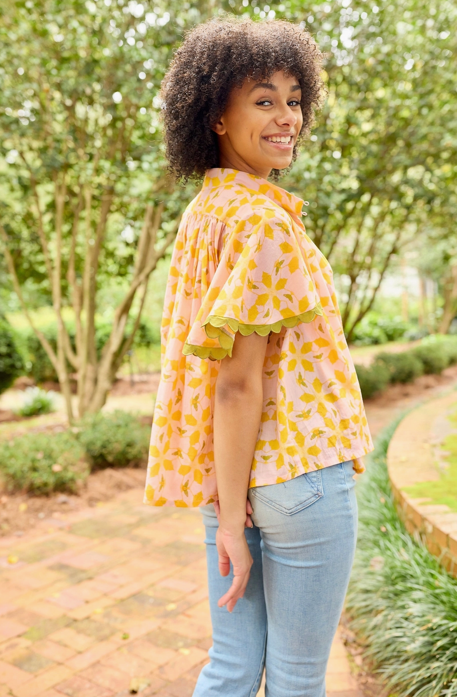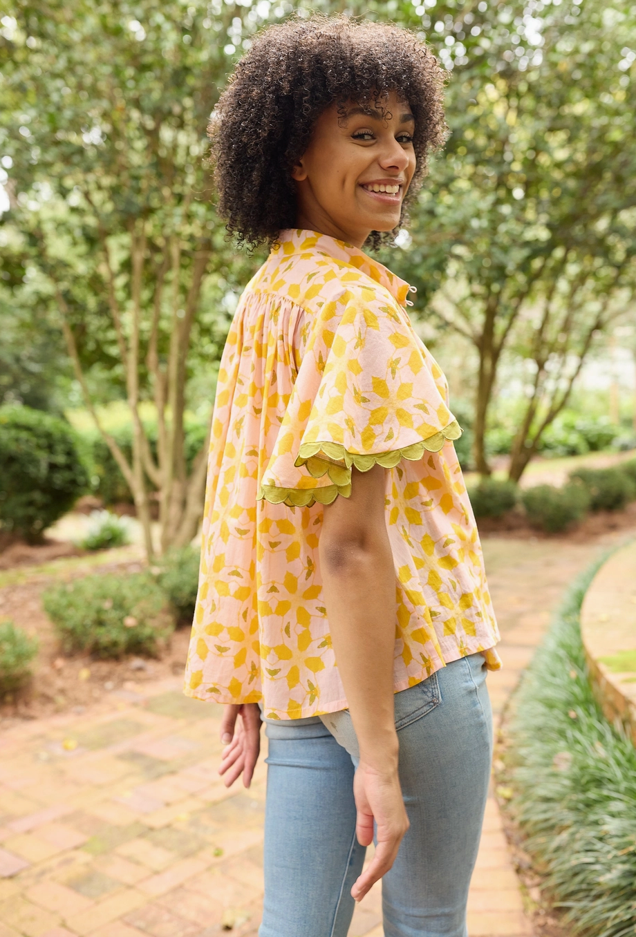 Meet our Parham Gathered Blouse. Crafted from a soft and light cotton voile, we have a feeling this blouse will be your go-to all spring and summer long. A delicate scalloped trim down the center front and on the sleeves adds a touch of contrast while pairing beautiful with our original Orange Azalea print. Gathering at the upper bust and back allow for a relaxed fit. Sizing: Runs true to size. Roomy, loose fit. Size Small measures 25" in length from HPS and 39" in the bust. Size Medium measures 25 5/8" in length from HPS and 41" in the bust. Size Large measures 26 1/4" in length from HPS and 44" in the bust. Details: - Button down - Fabric covered buttons - Mandarin style collar - Scalloped trim down center front placket and sleeve hem - Gathering at upper bust and back - Digitally printed with original prints - Packaged in a recycled plastic bag for protection Care Instructions: - Turn inside out before washing - Wash on cold on gentle - Hang dry - Steam
