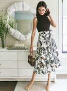 - Fit-and-flare, mock neck midi dress with a ponte bodice and woven skirt with side seam pockets.
