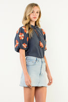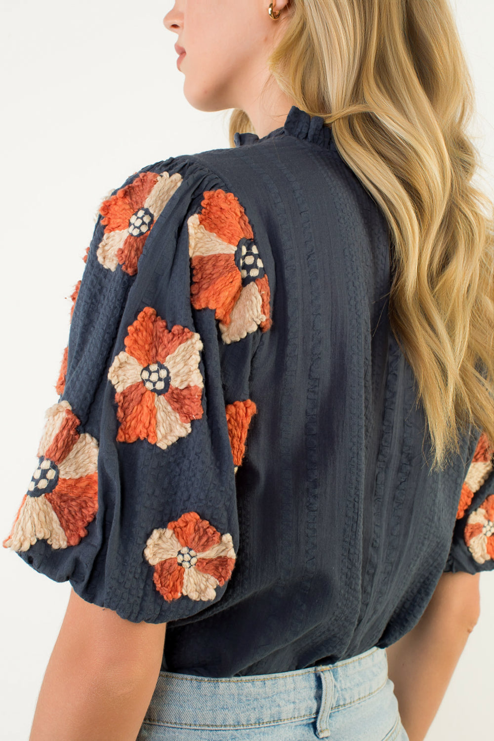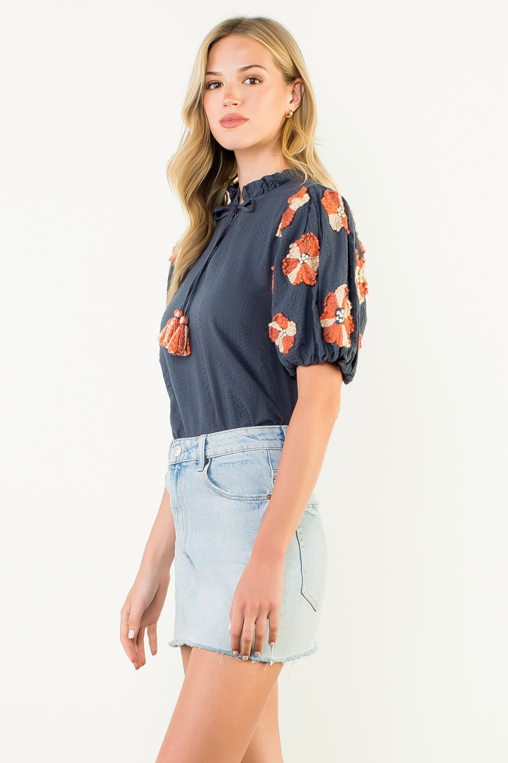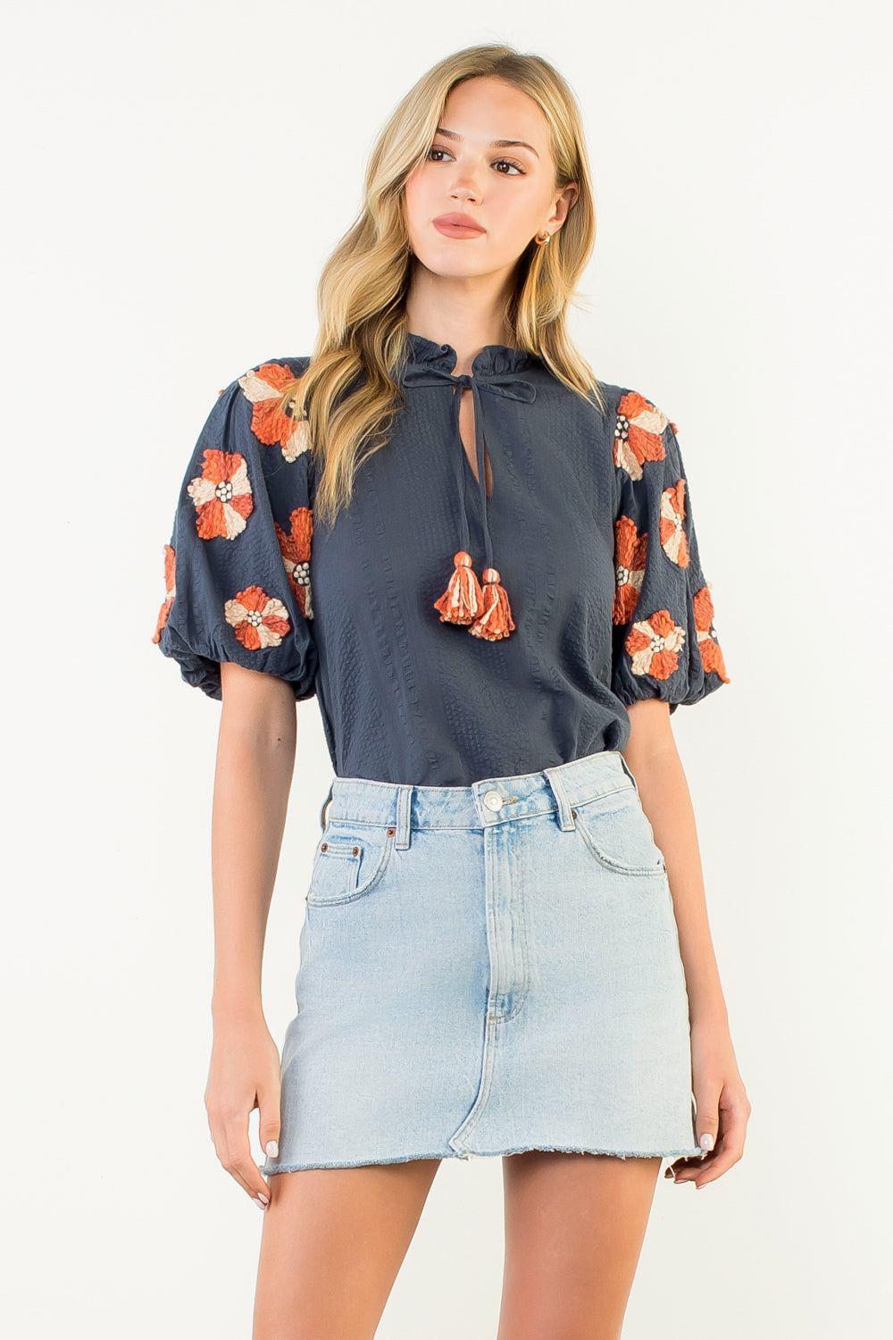 The relaxed silhouette is elevated with statement puff sleeves adorned in vibrant floral embroidery, blending bold colors with a feminine flair. A keyhole neckline finished with tasseled ties adds a fun, bohemian-inspired touch, while the gathered hem of the sleeves creates a flattering, billowy shape.