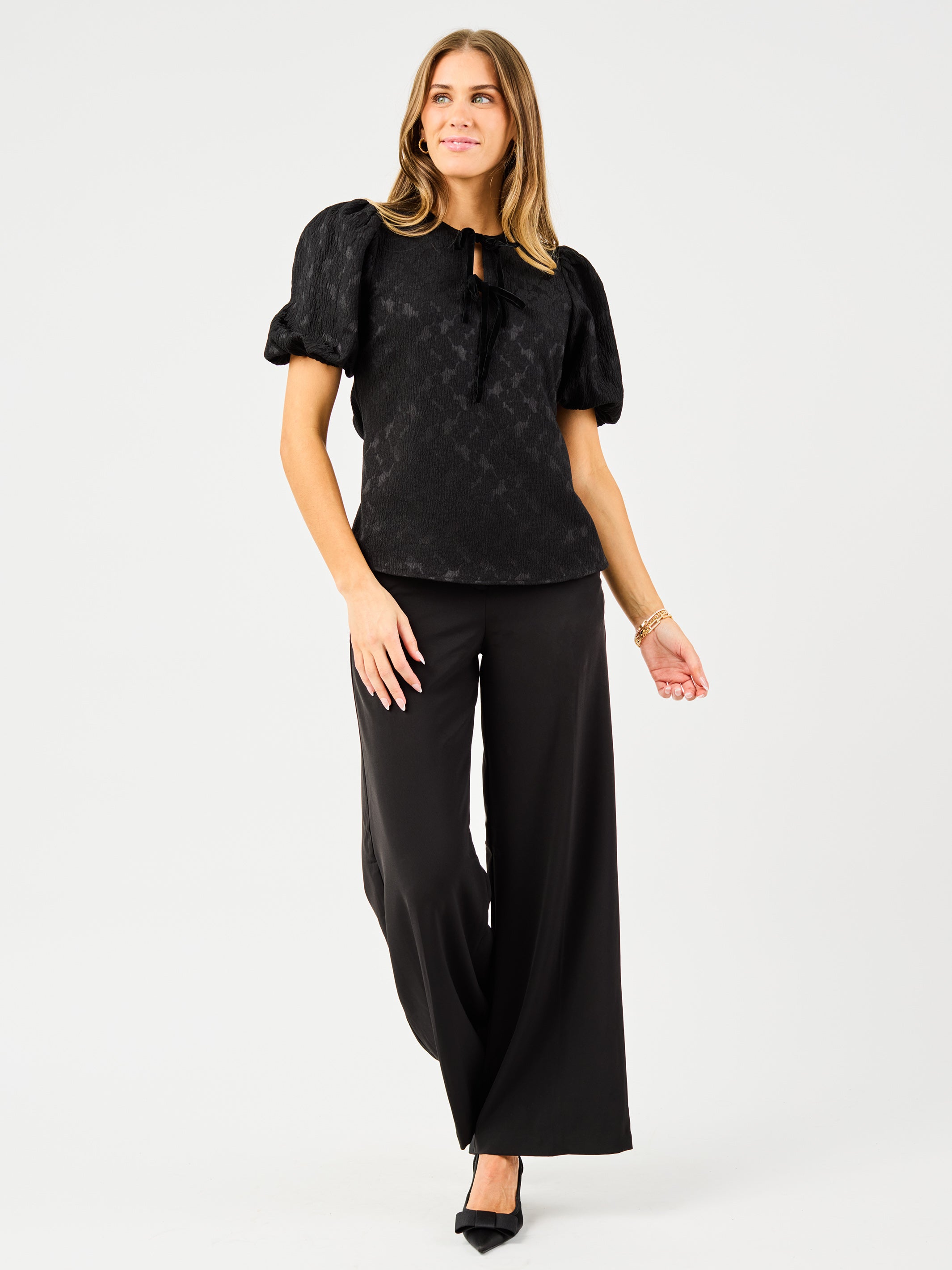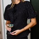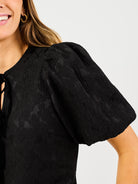 Elegant with a touch of drama, this black blouse is crafted in a subtle tonal jacquard for a sophisticated finish. Featuring statement puff sleeves, a delicate keyhole neckline with velvet tie detail, and a tailored silhouette, it’s the perfect piece for evening occasions or elevated everyday wear. Pair it with sleek trousers or a skirt for a chic, modern look.