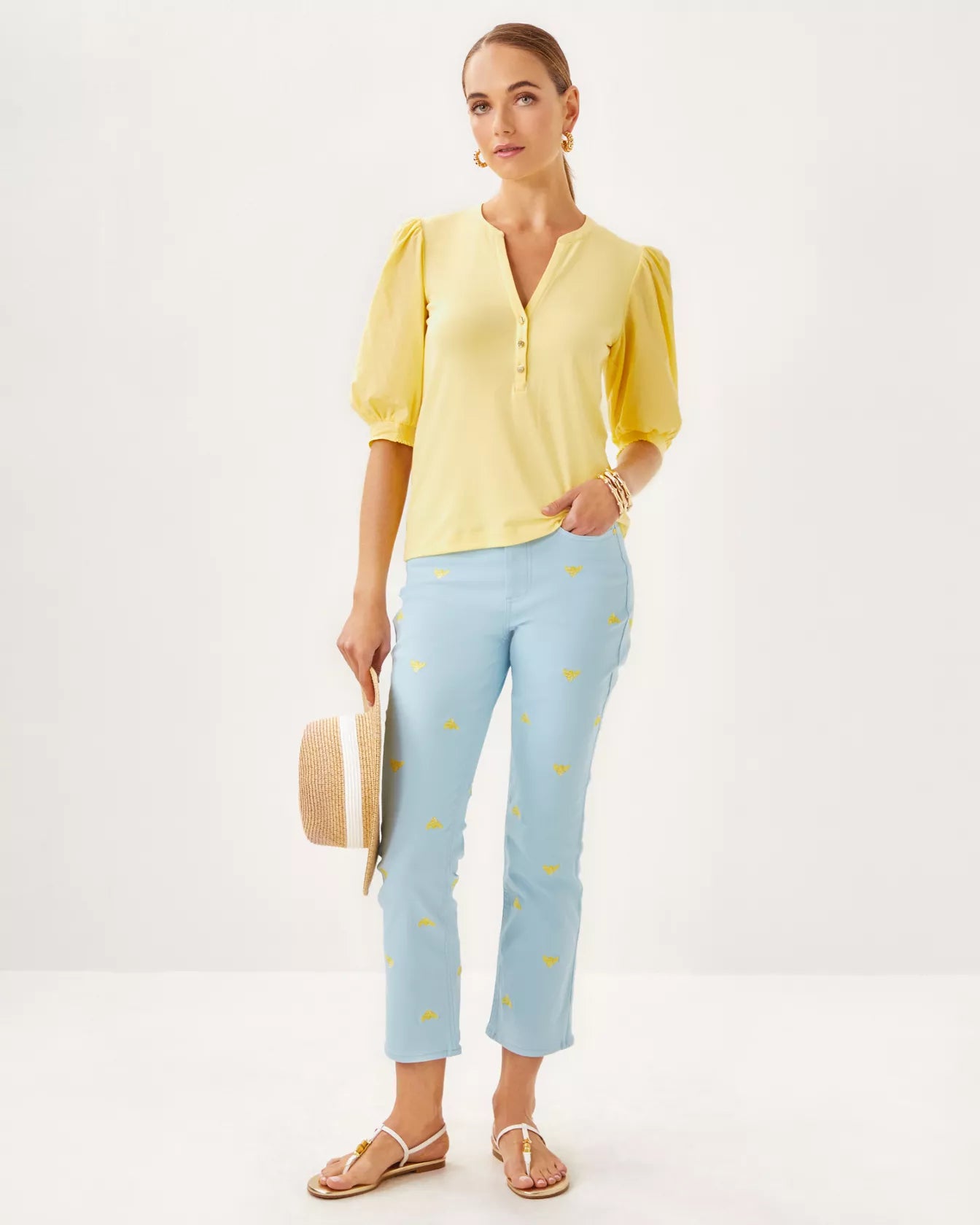 - Straight fit top with puff sleeves, smocked cuffs, buttons, and a crew notched neckline.
