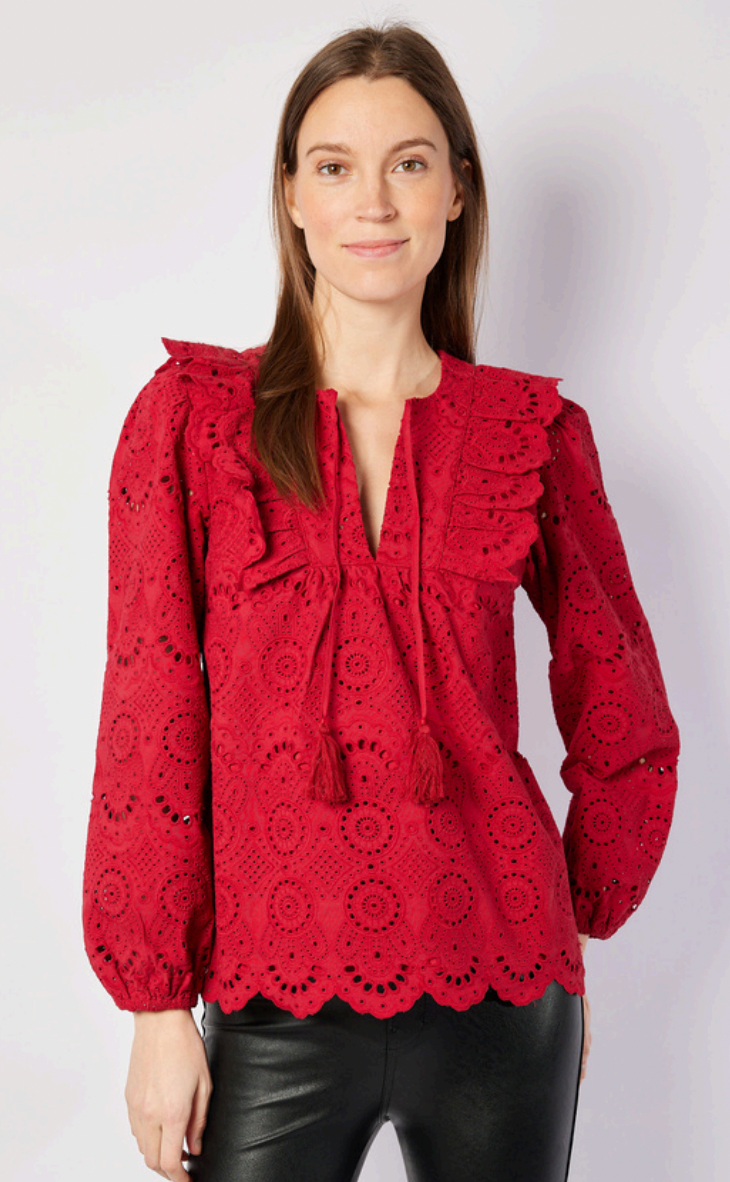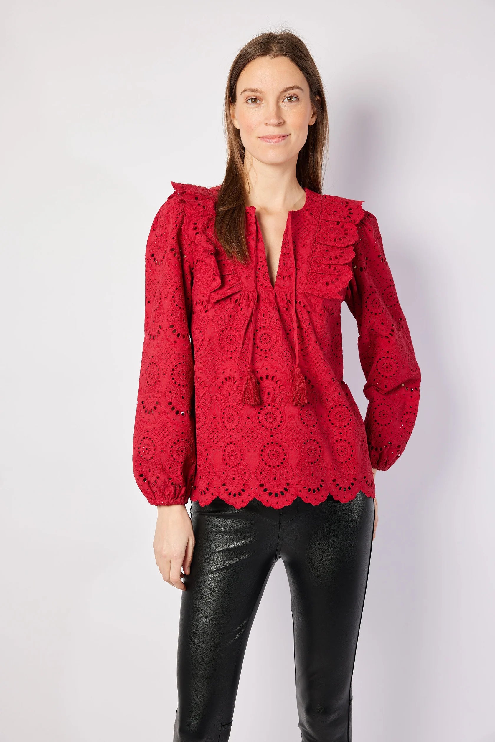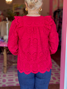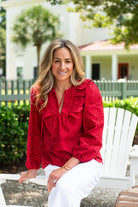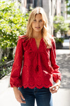 As the leaves begin to change and the temps start to drop, continue to look classic with this Ruffle Front Top. We truly think ivory eyelet belongs in everyone's fall capsule wardrobes, the ultimate neutral to keep outfits looking fresh. You will find us pairing this with our favorite crisp, ecru denim for cookbook club night and flower arranging dates with the besties.